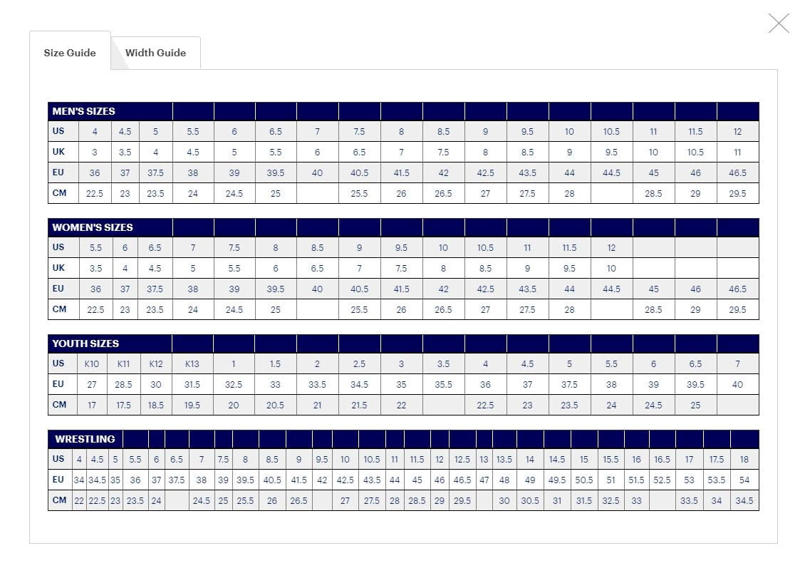 asics trainer size chart