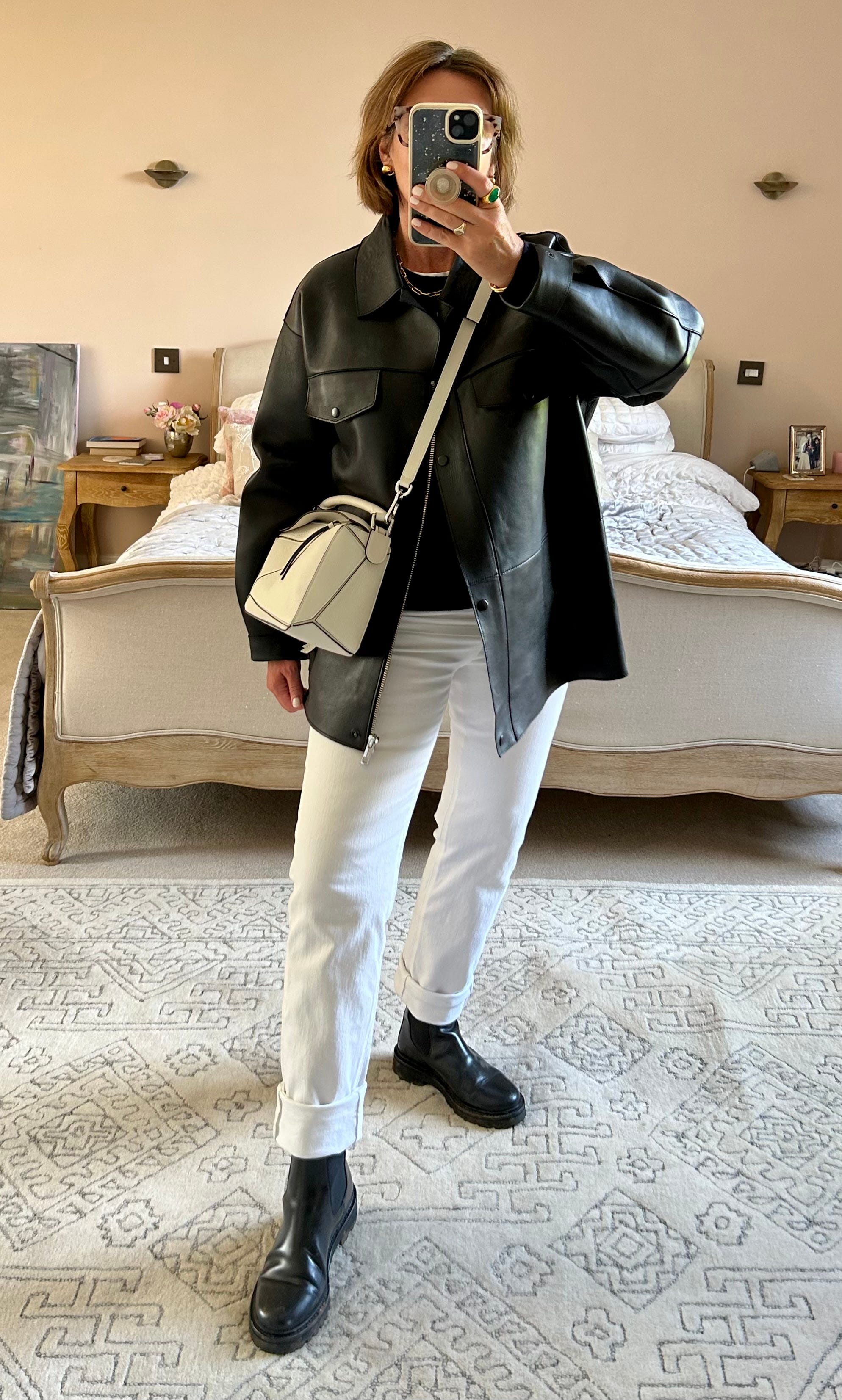black jacket white pants