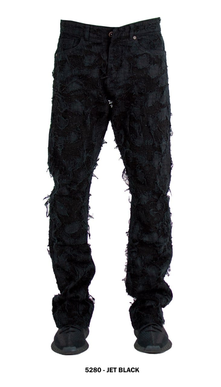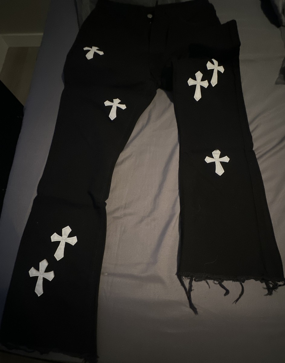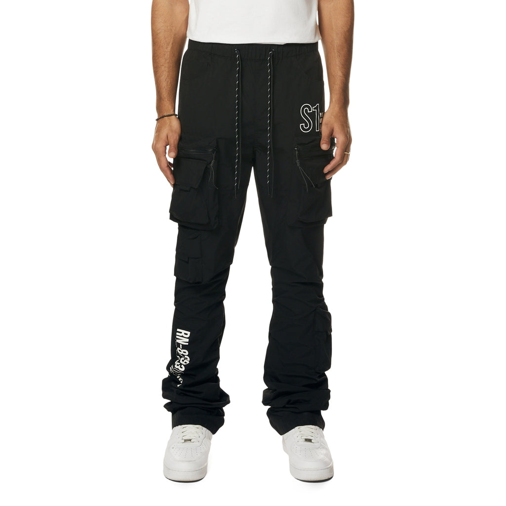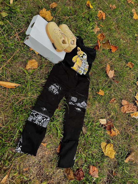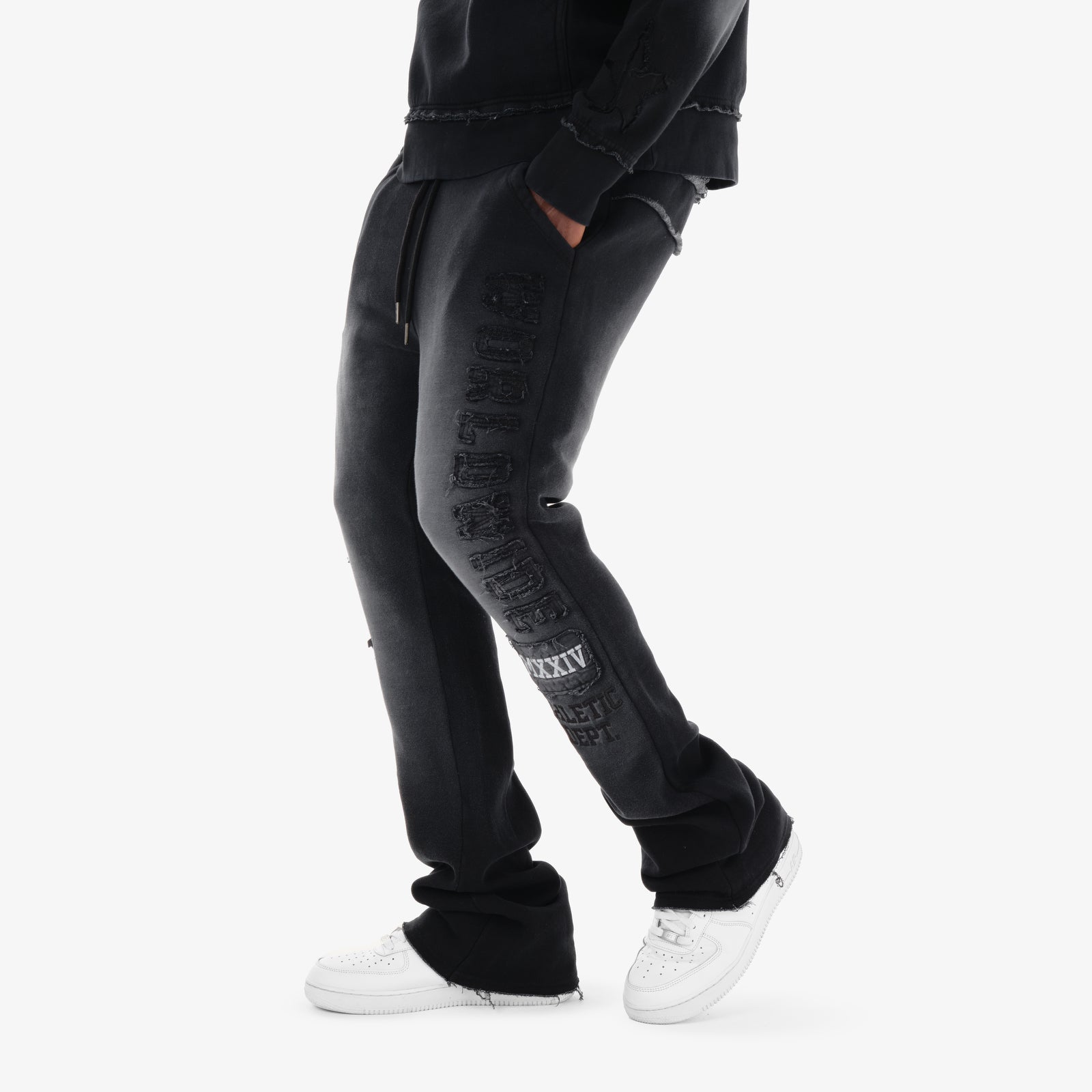 black stacked pants