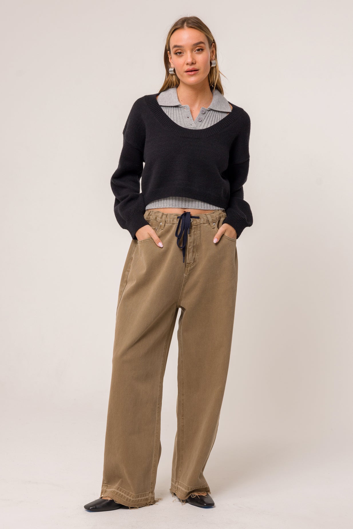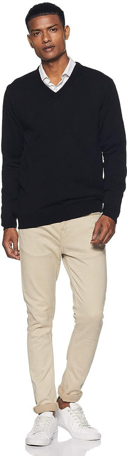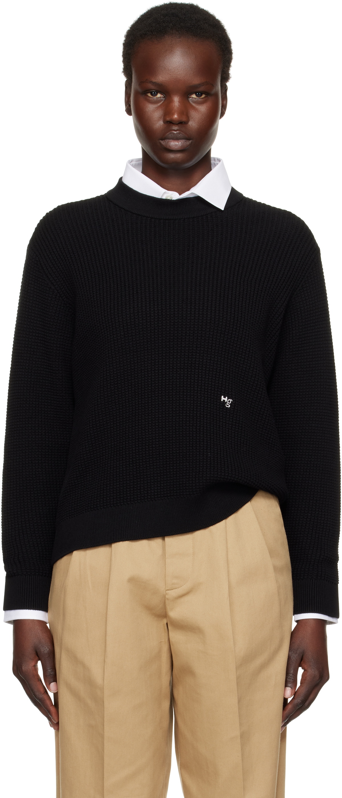 black sweater khaki pants