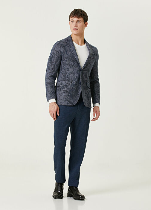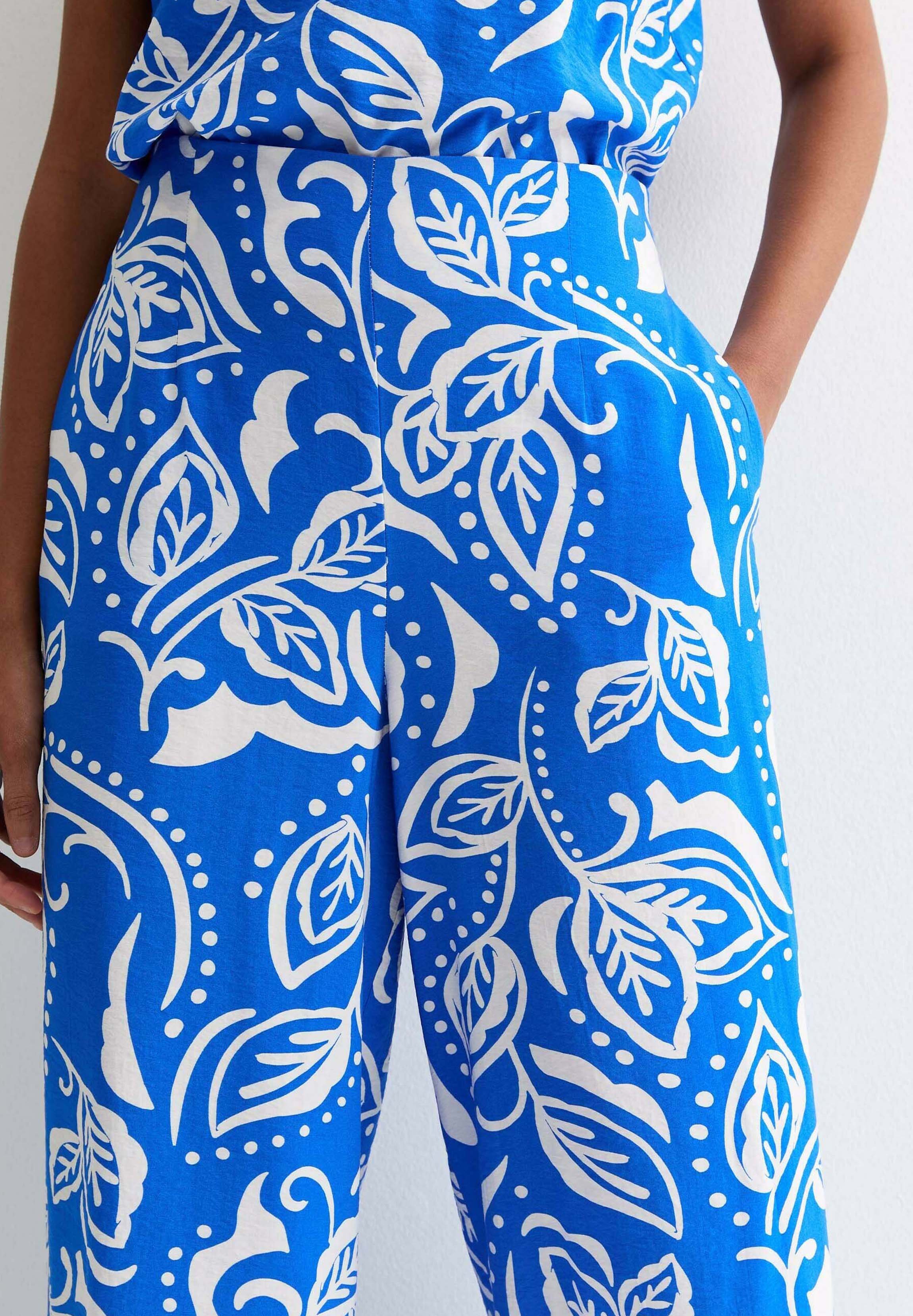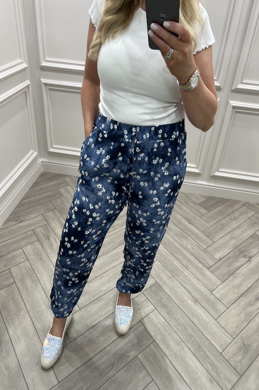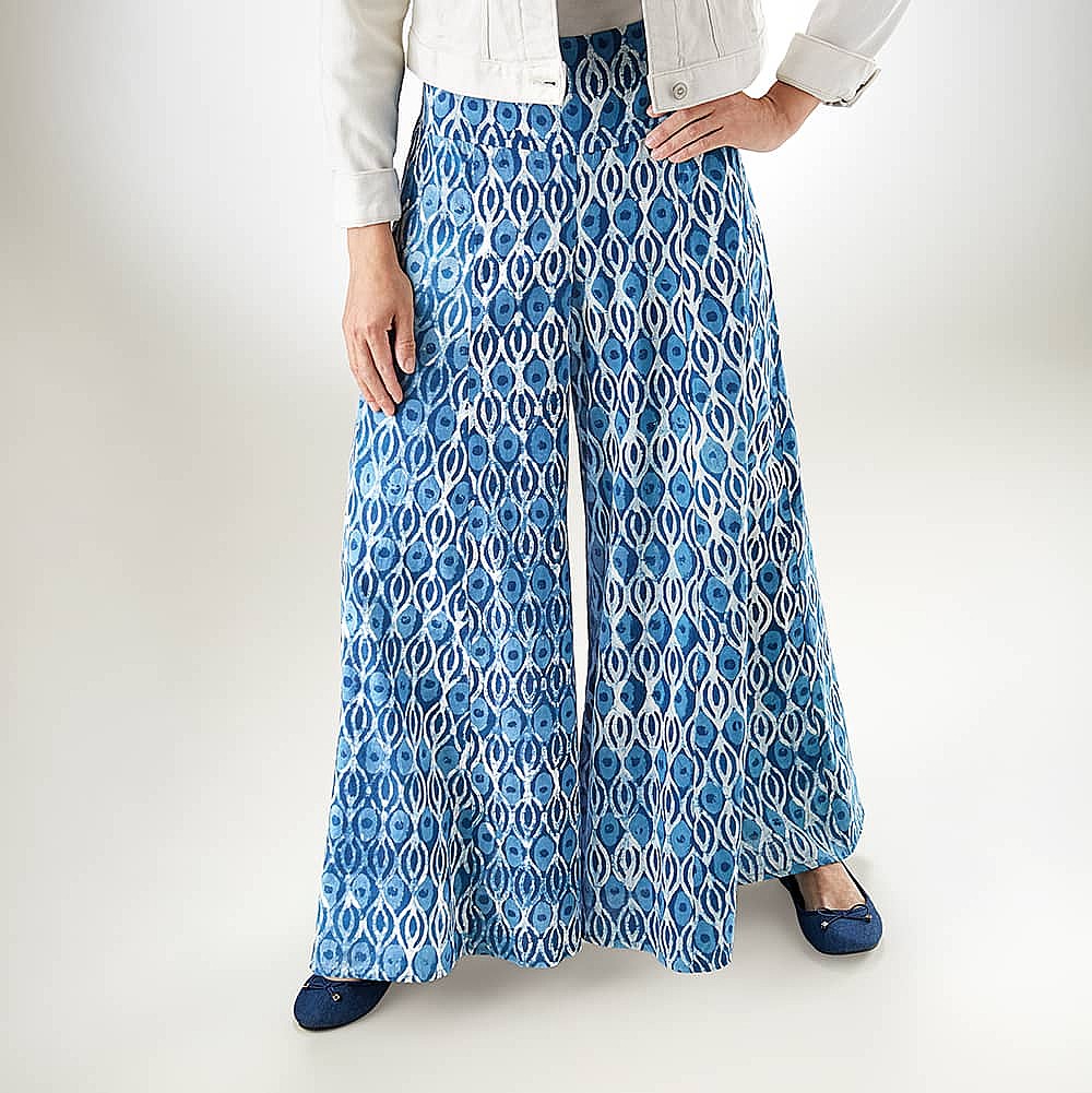 blue patterned trousers