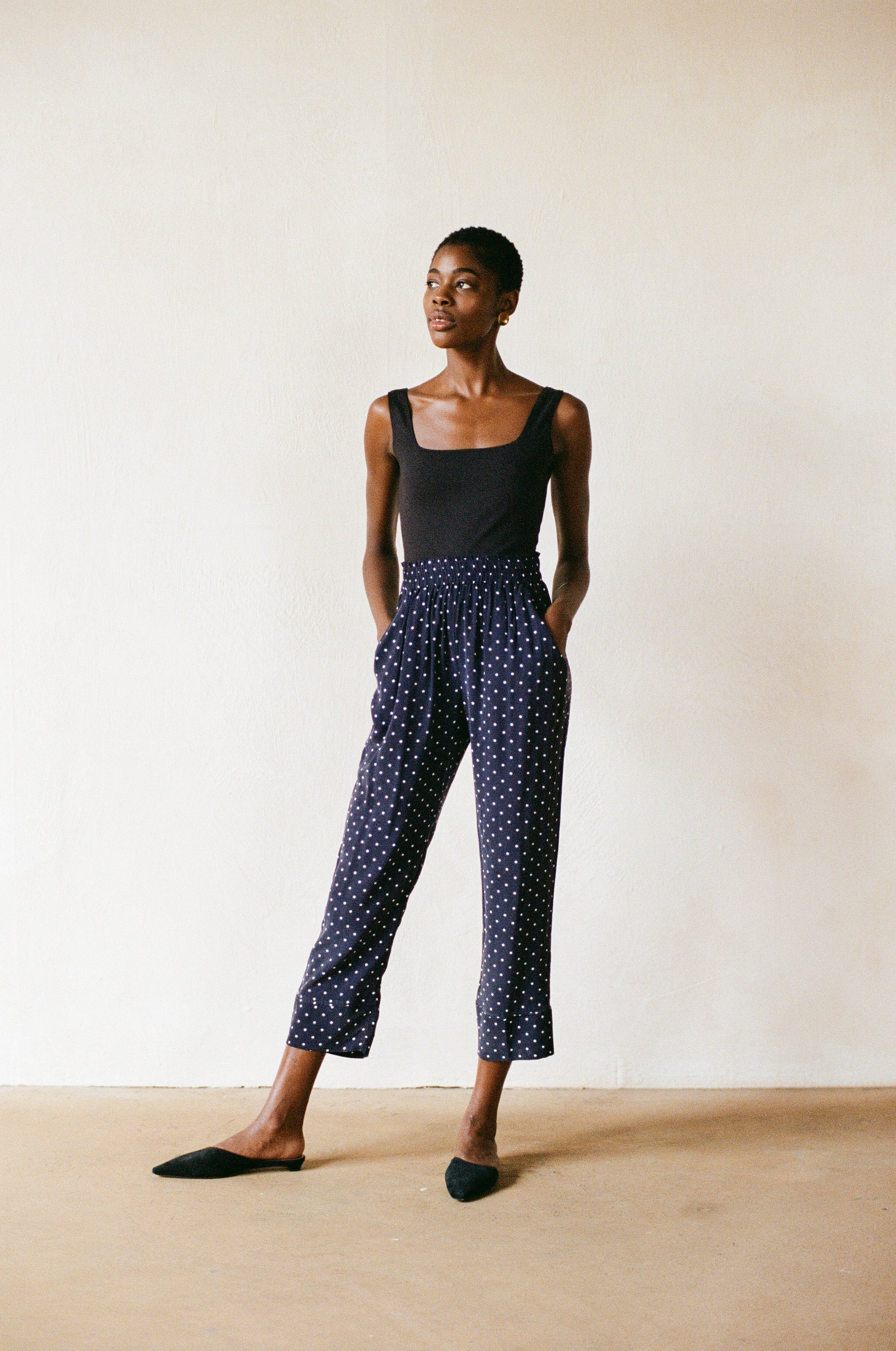 blue polka dot trousers