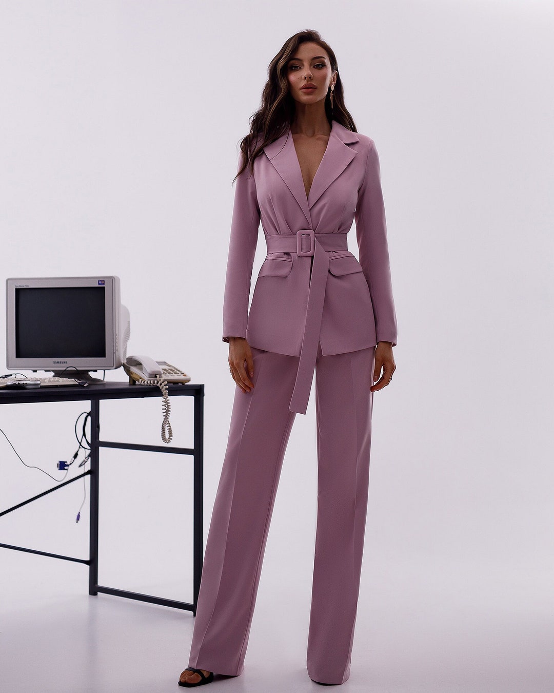 bright pink trouser suit