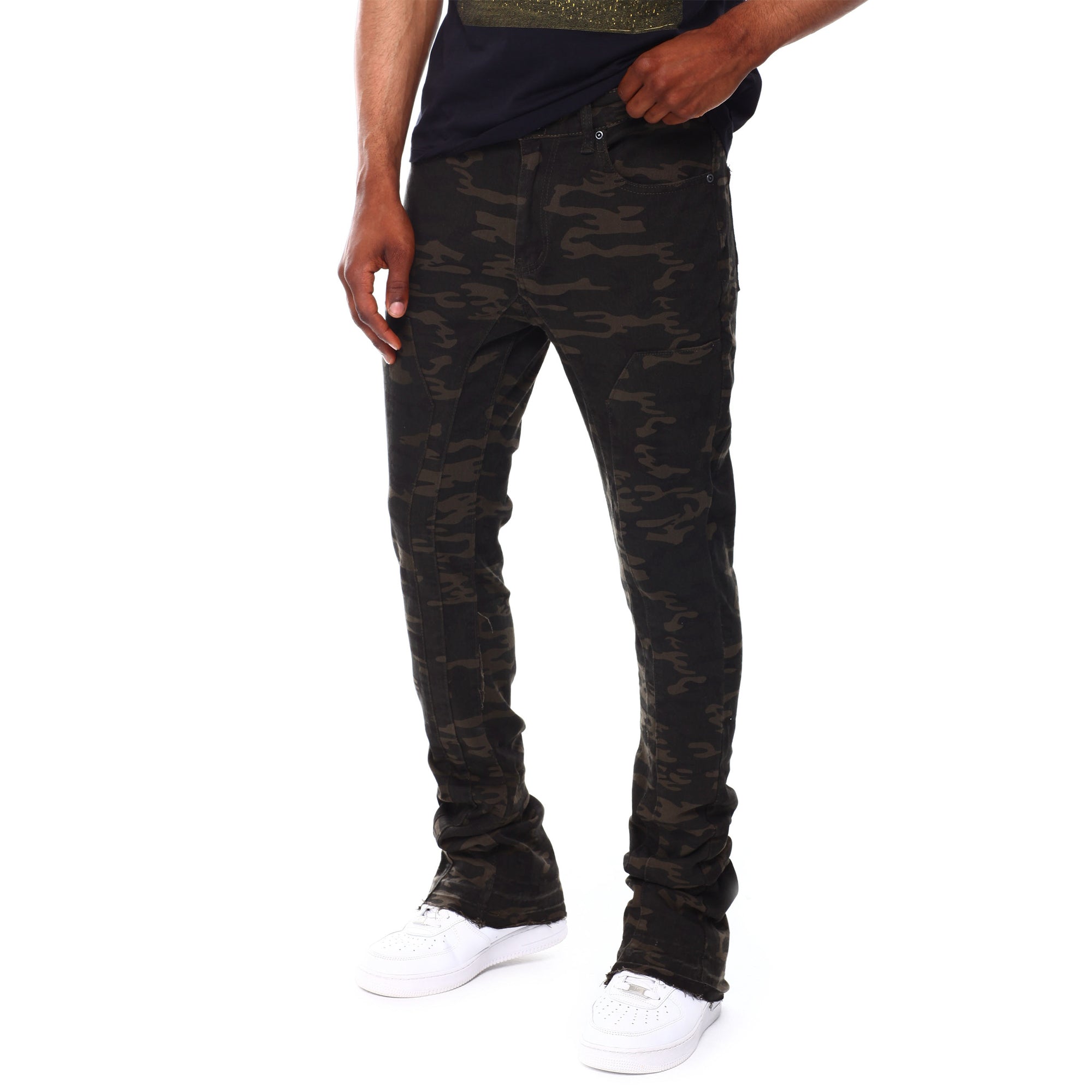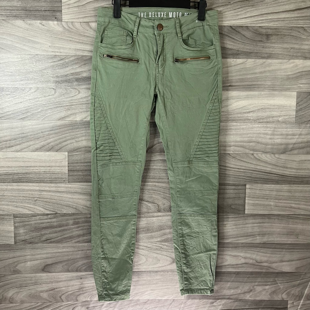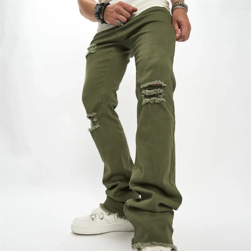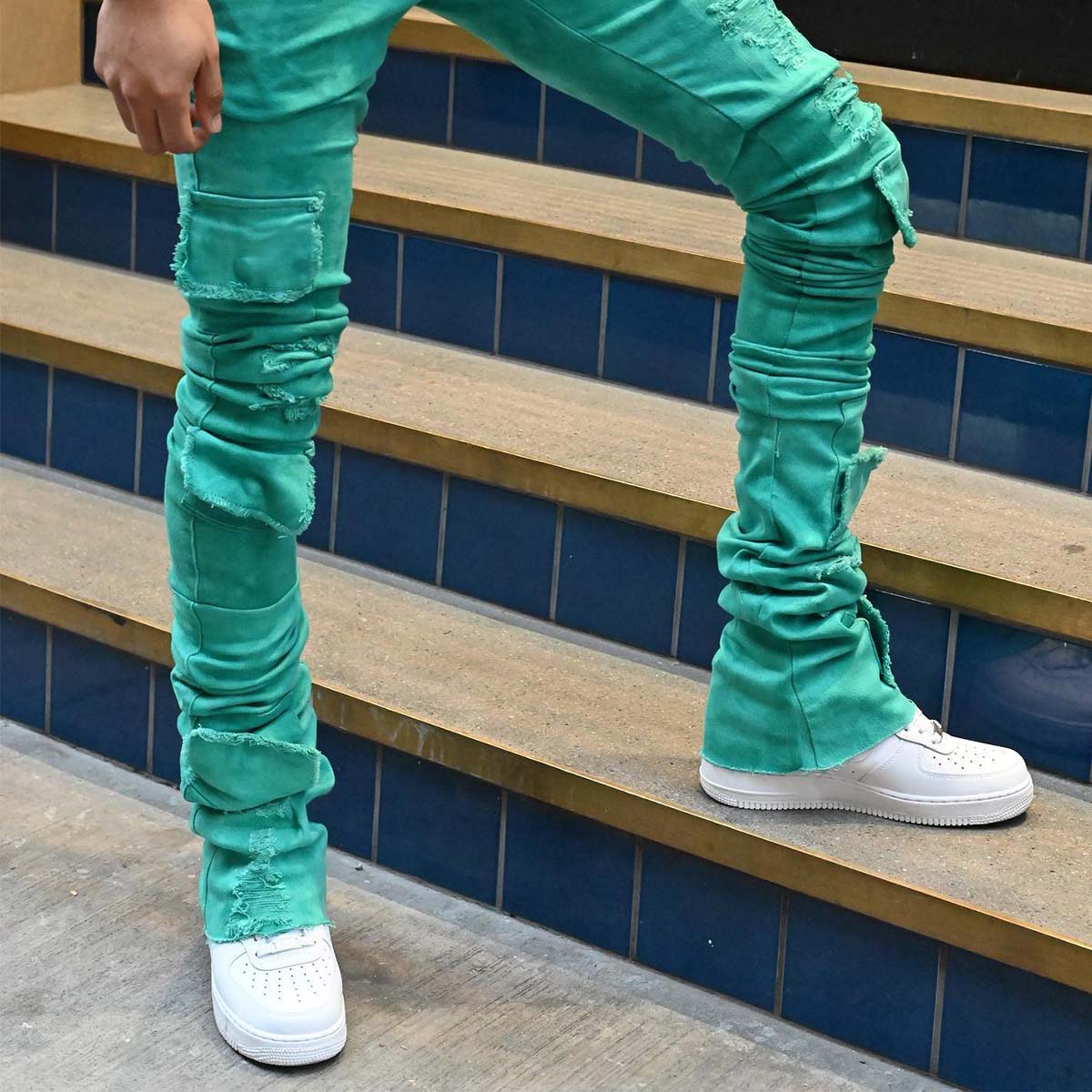 green stacked jeans