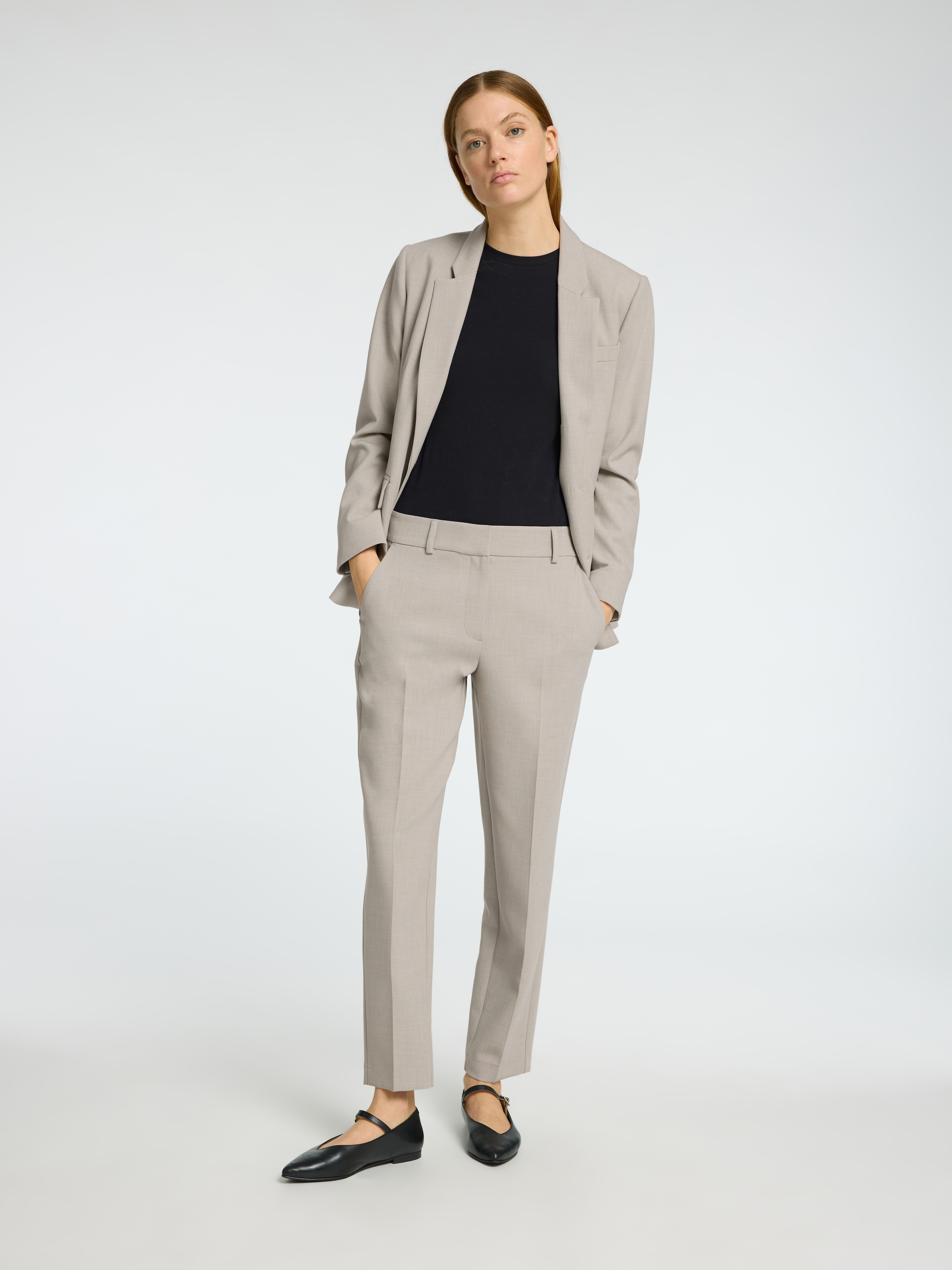 grey blazer with khaki pants