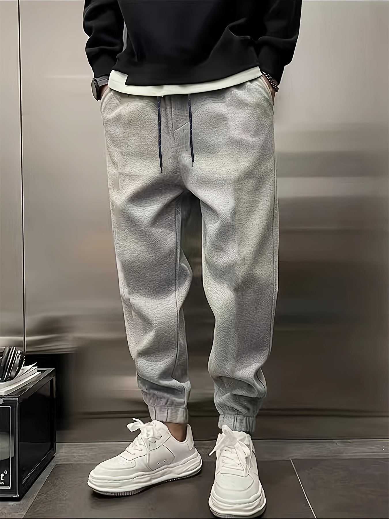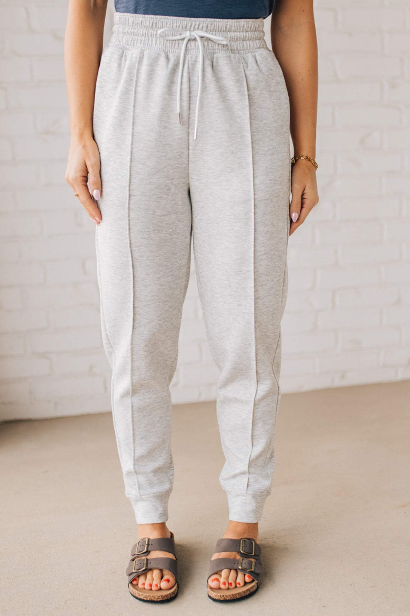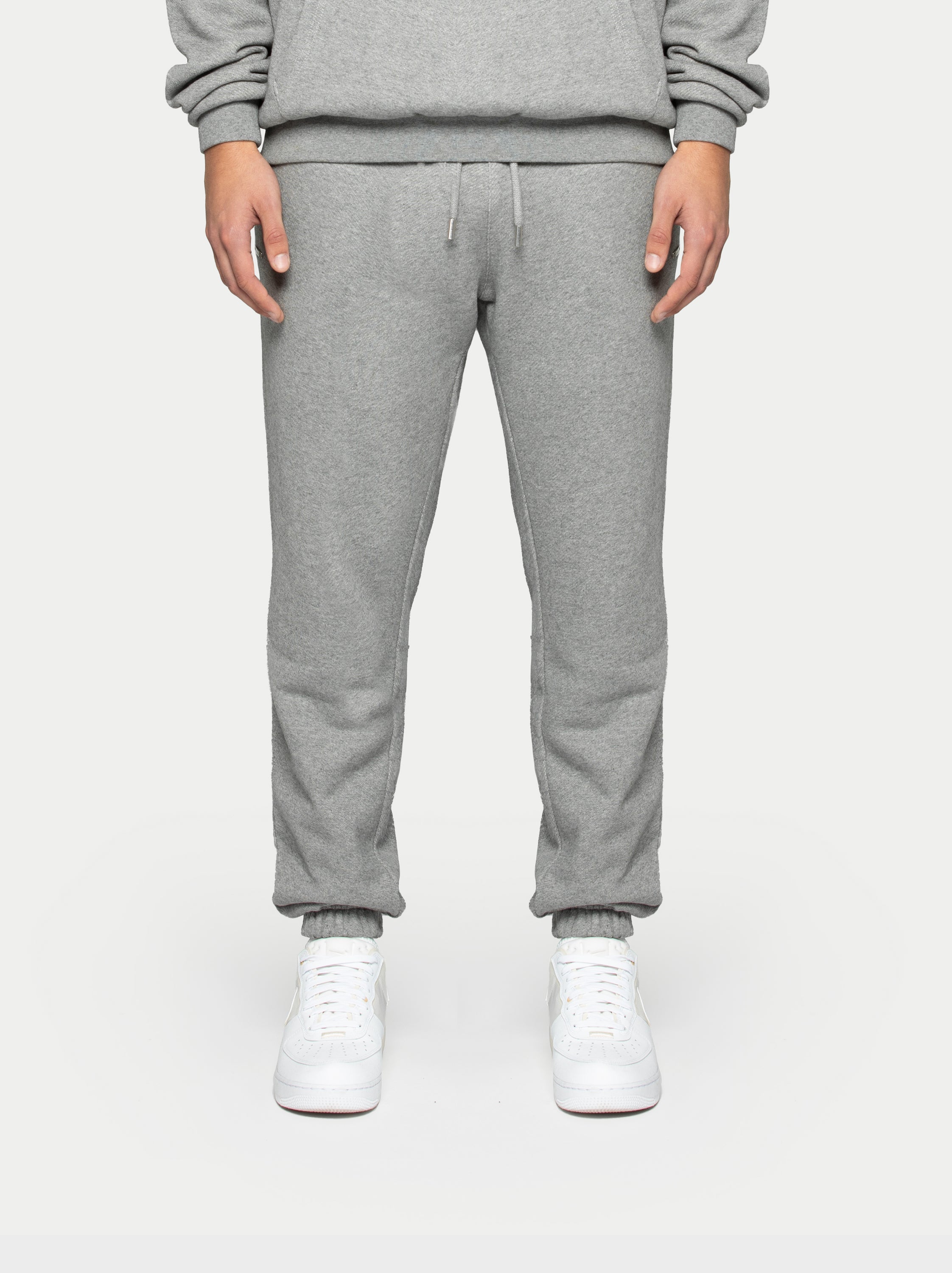 grey joggers with white drawstring