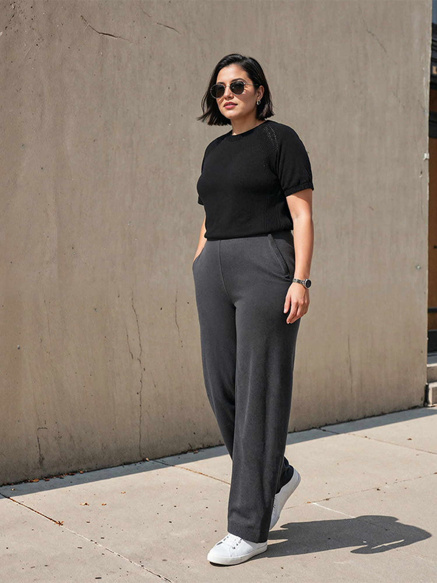 grey pants black top