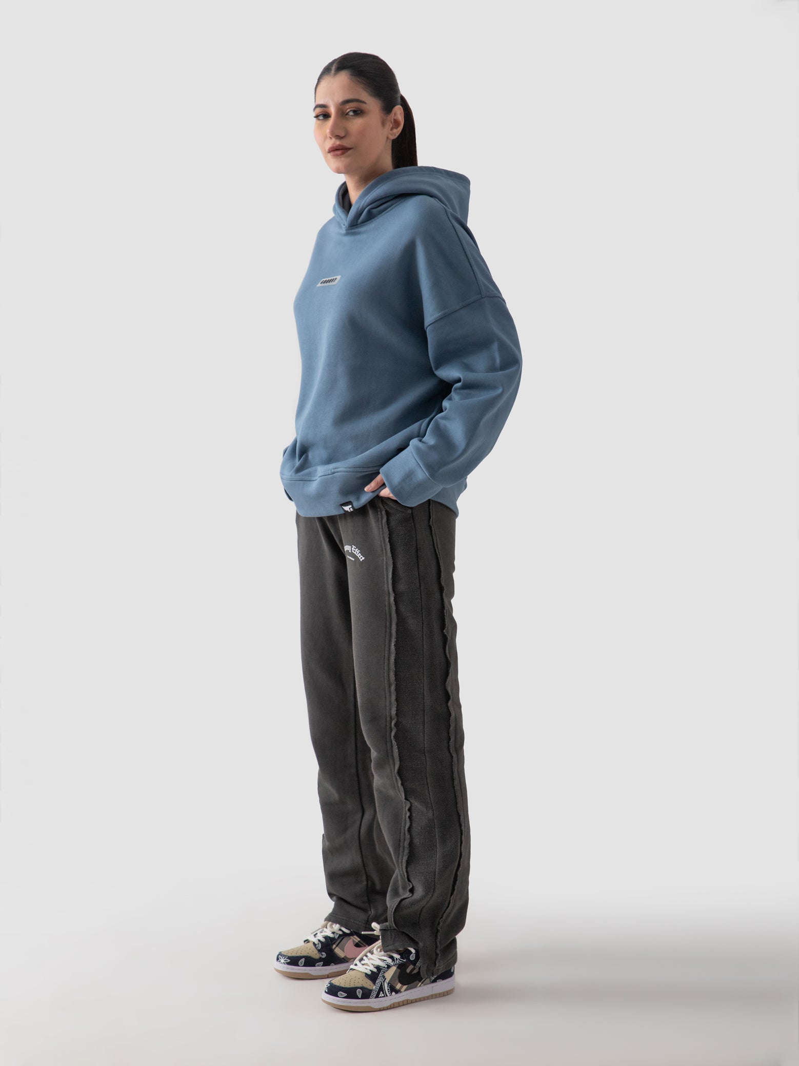 light blue sweatpants and sweatshirt