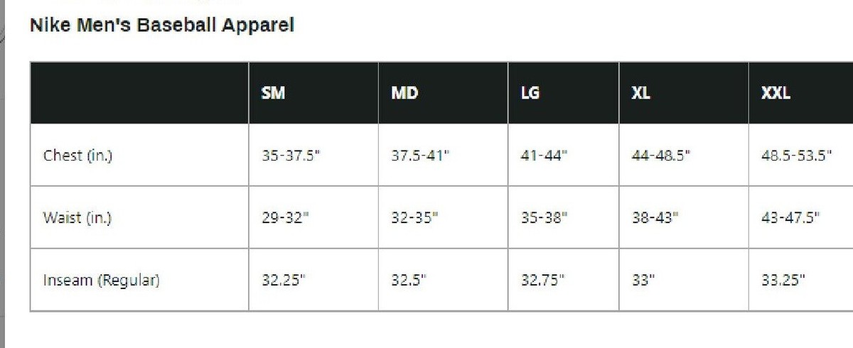 nike baseball pants size chart
