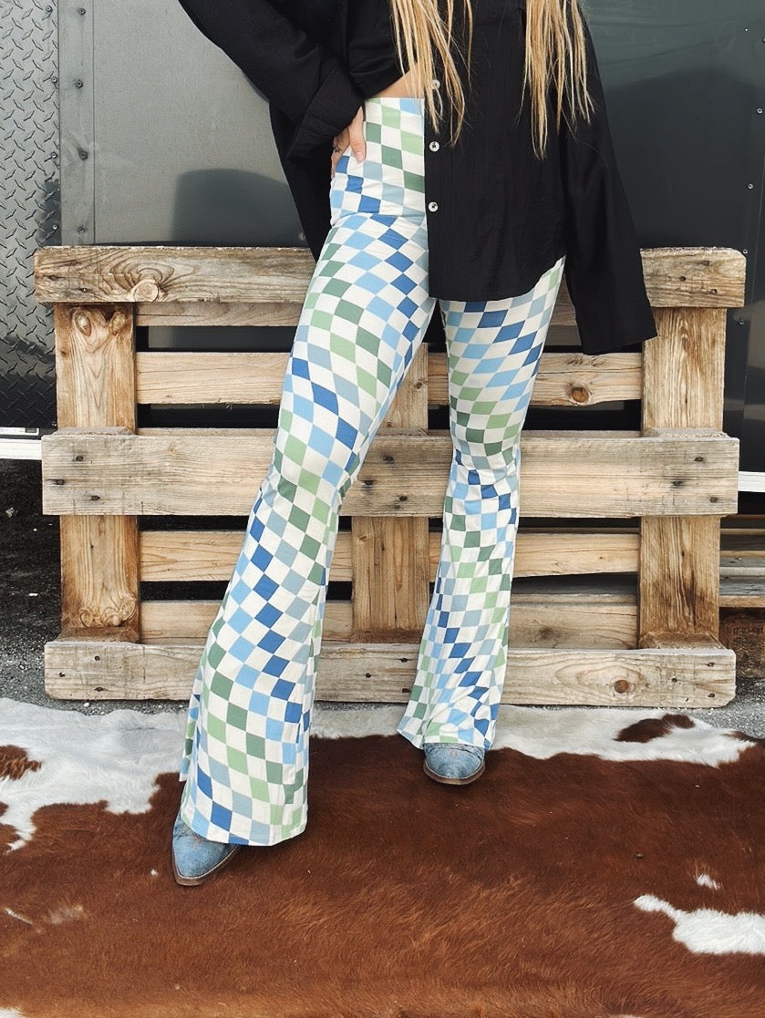 patterned bell bottom jeans