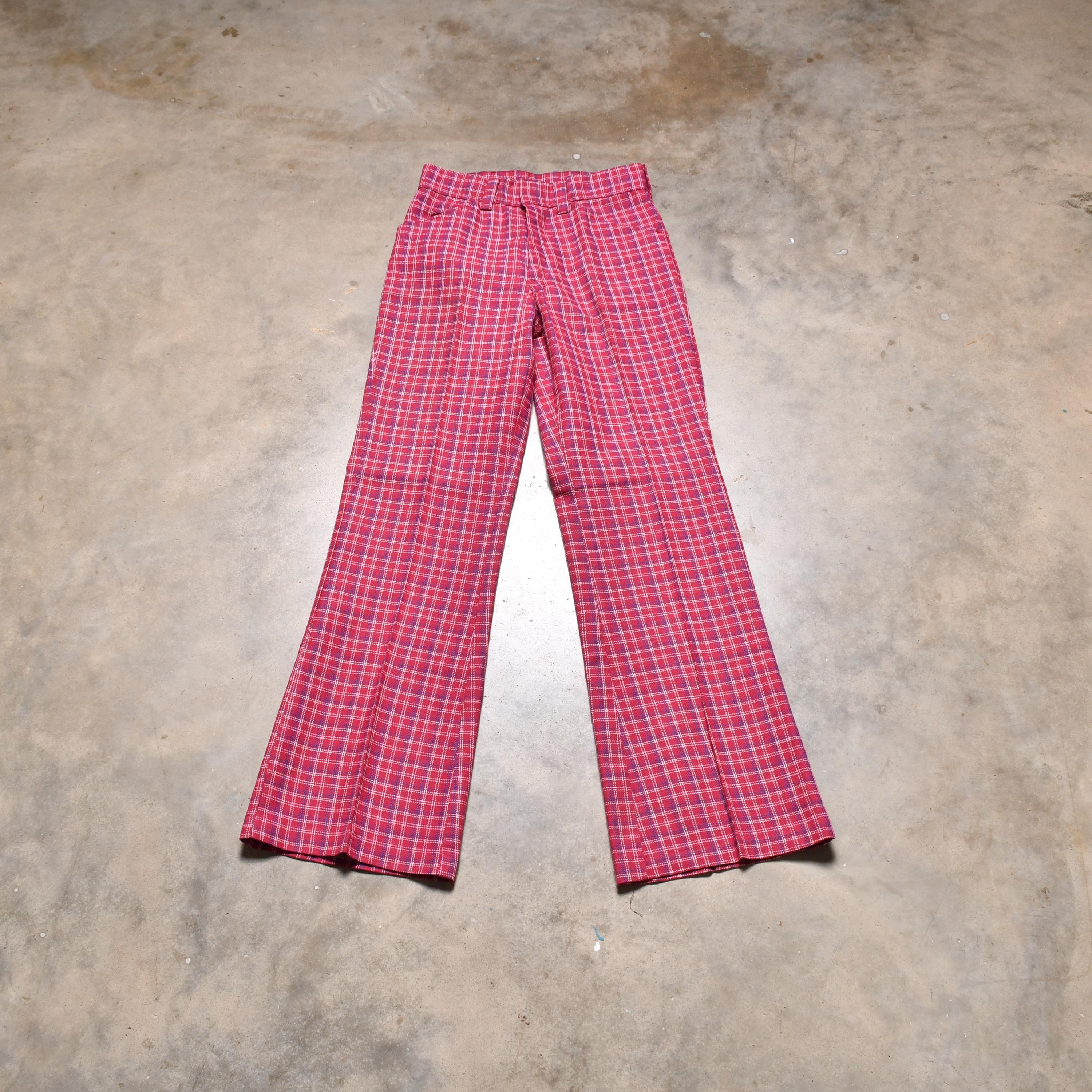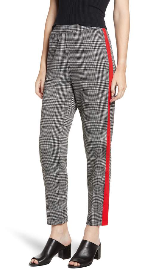 plaid pants with red side stripe