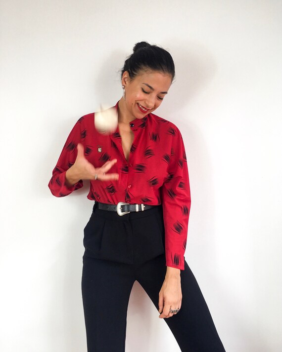 red blouse black pants