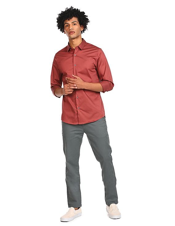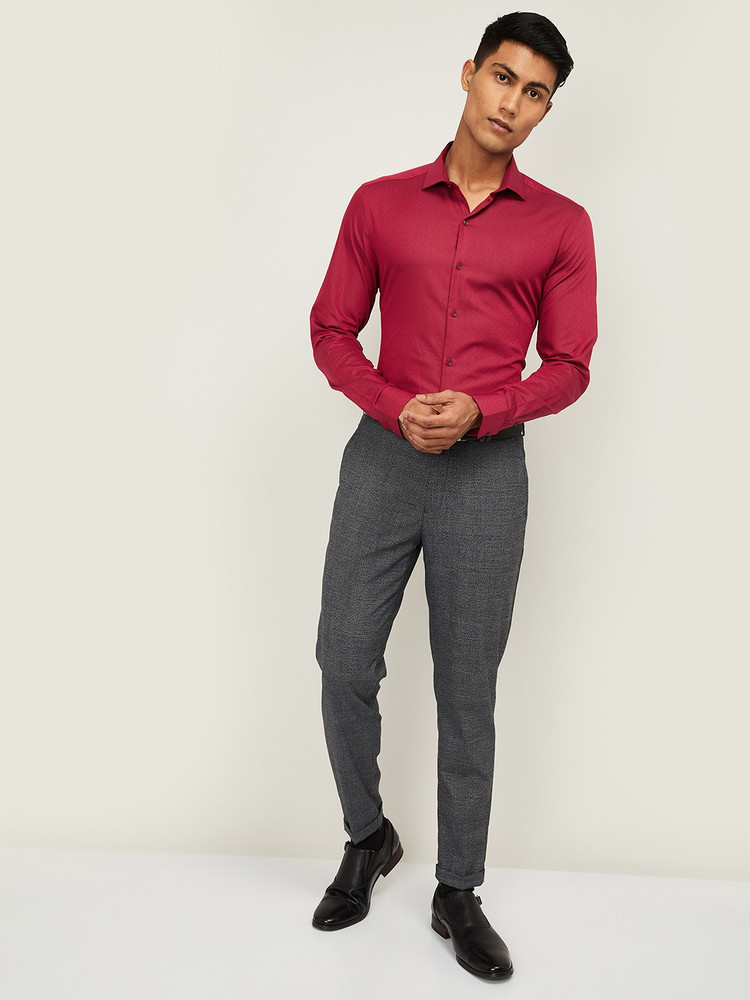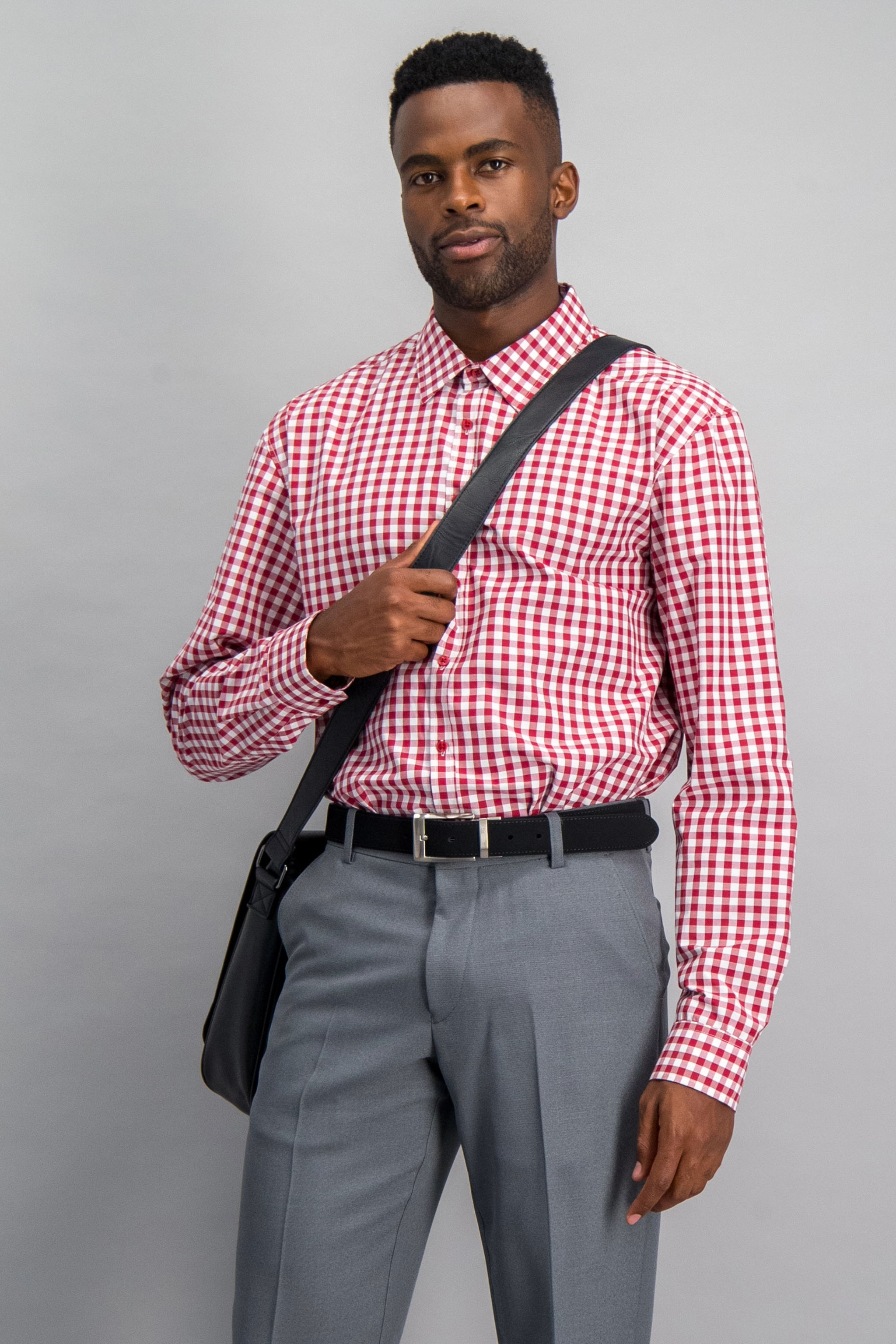 red shirt grey pants