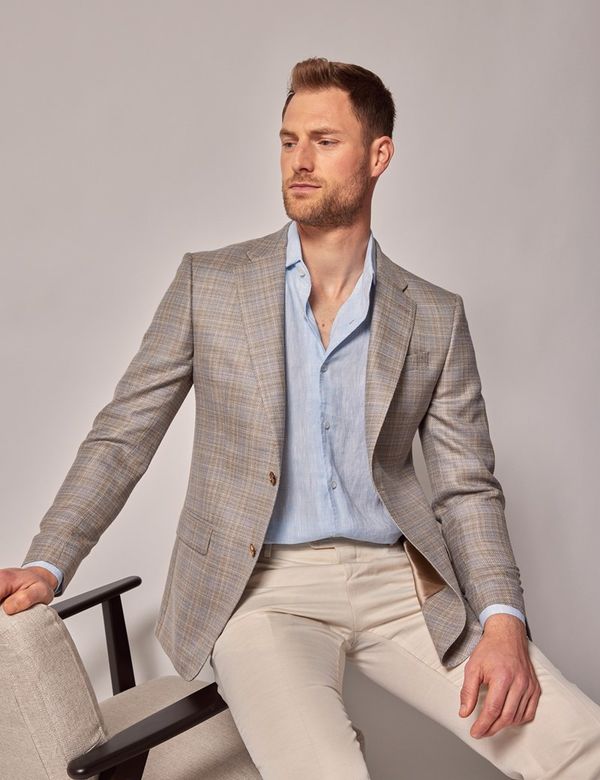 tan blazer blue pants