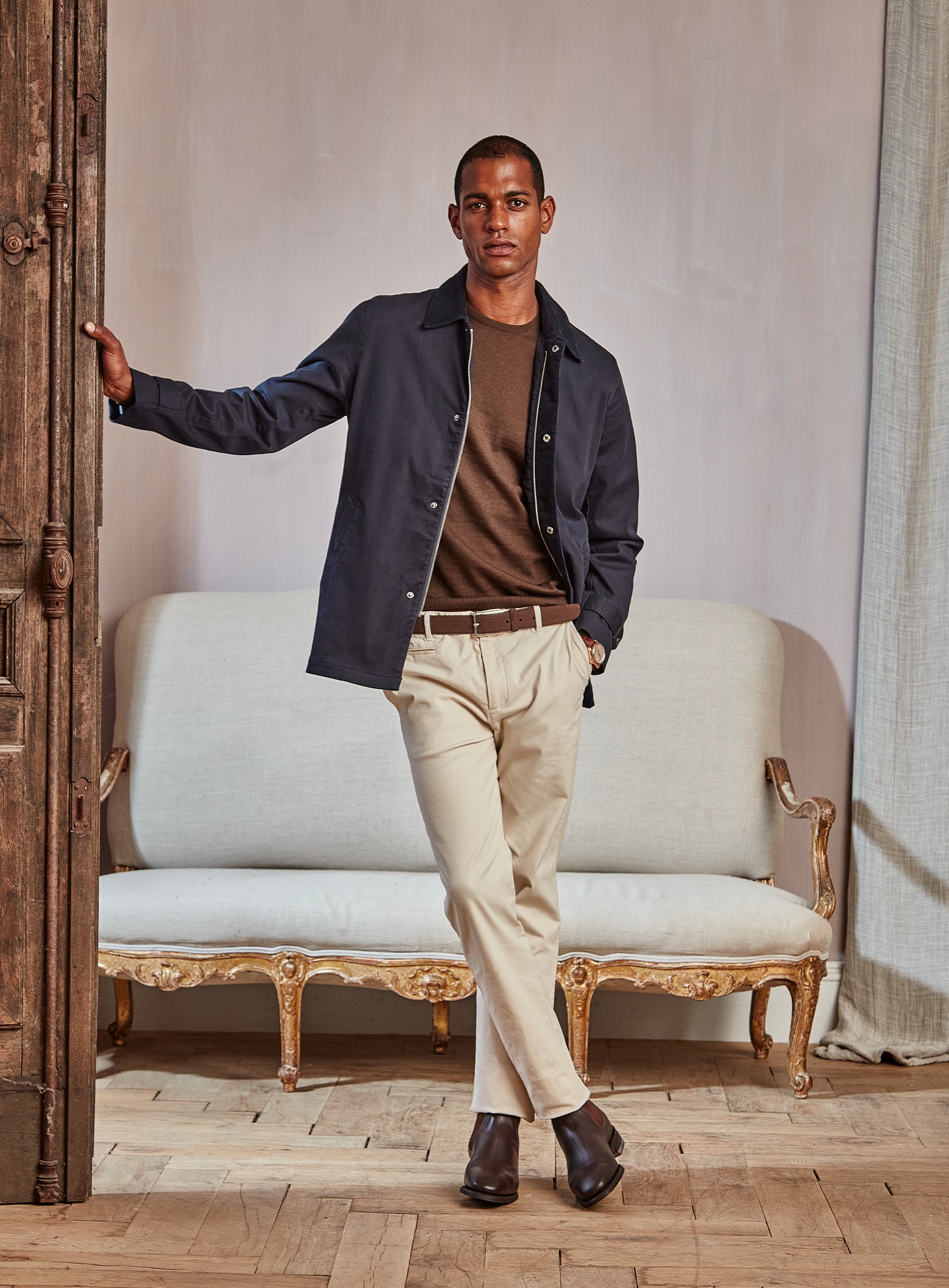 tan jacket navy pants