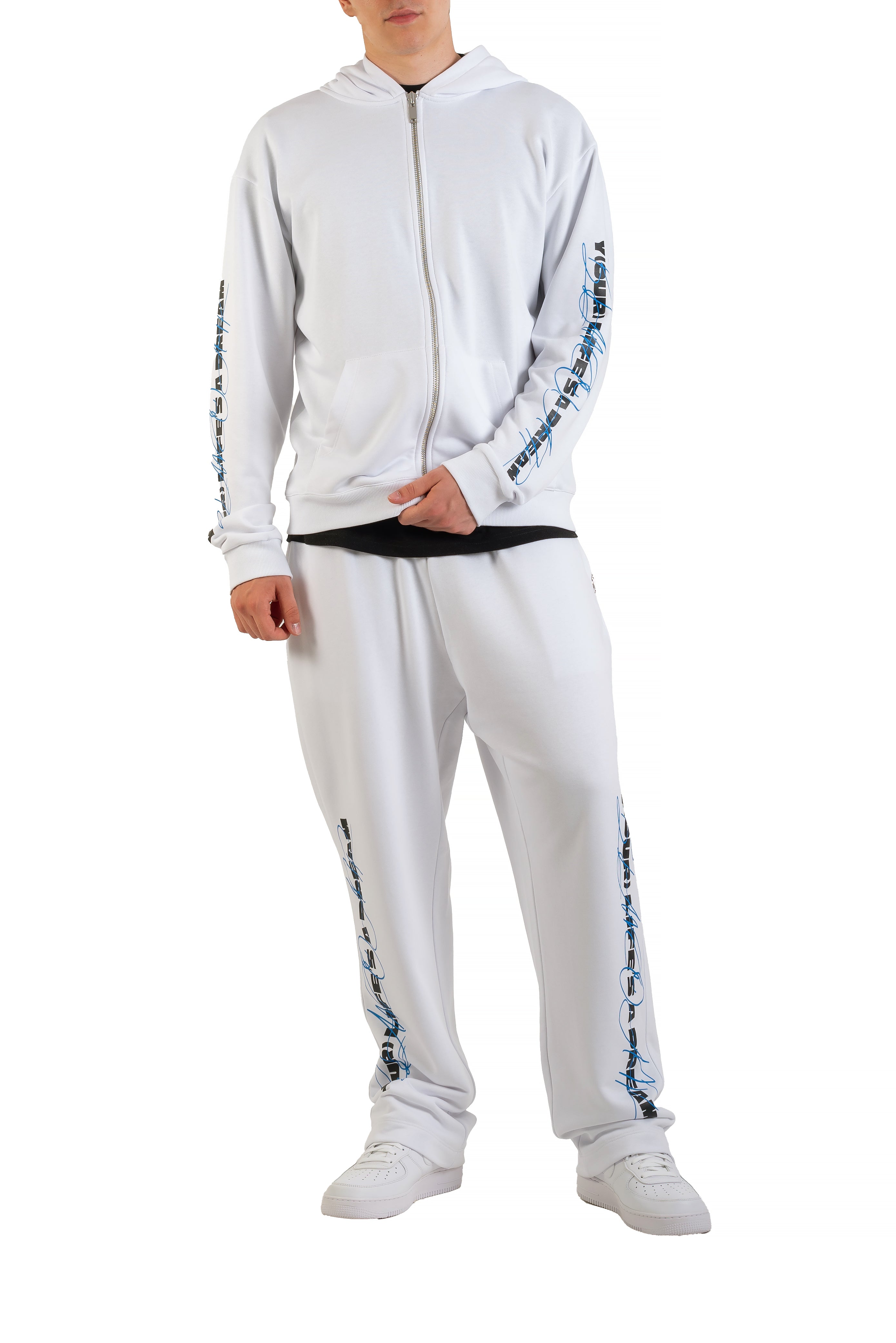 white and blue sweatpants