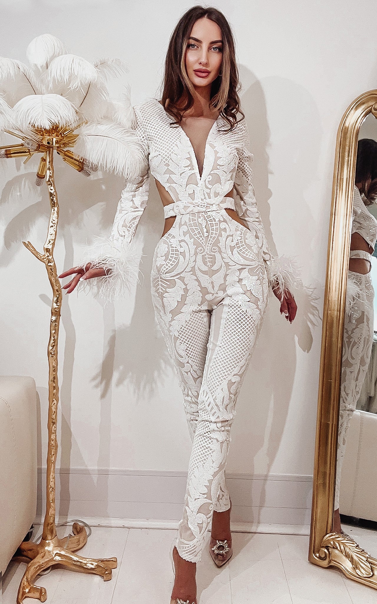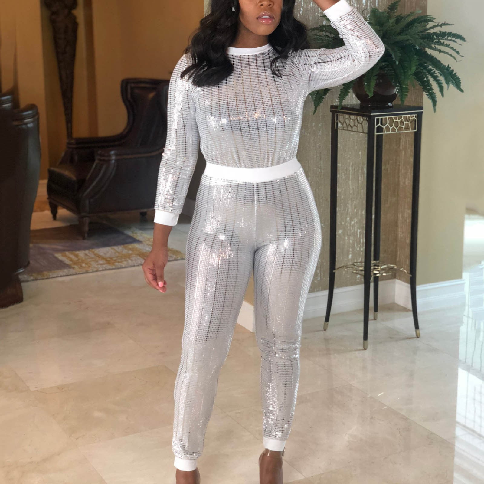 white sequin pantsuit