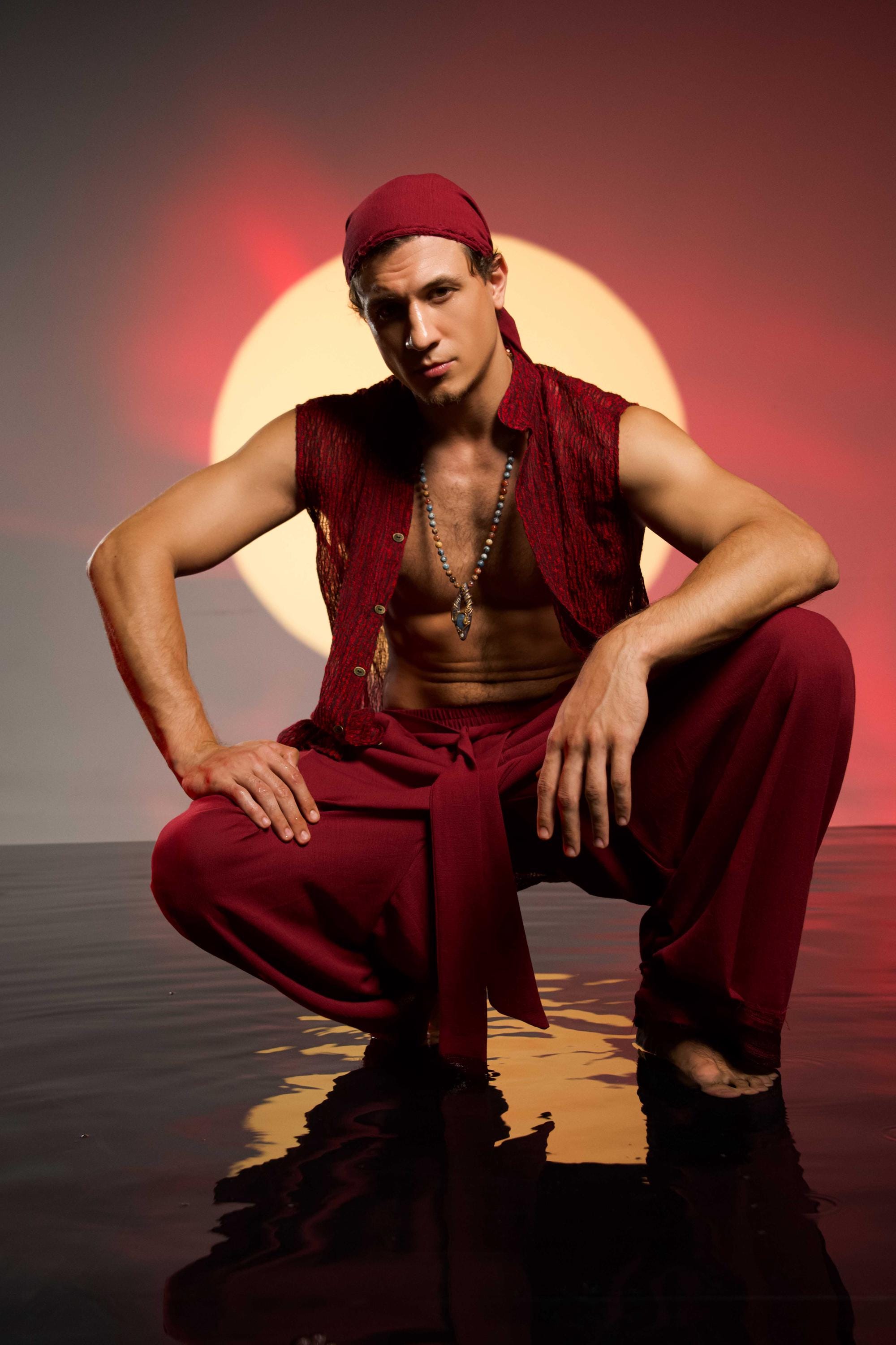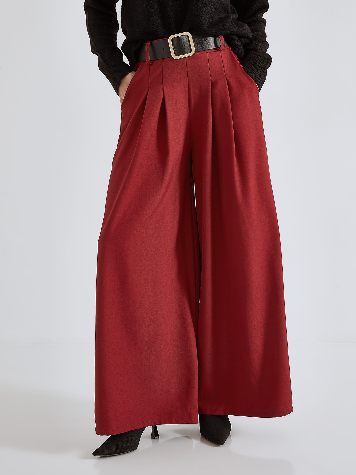 wine red trousers