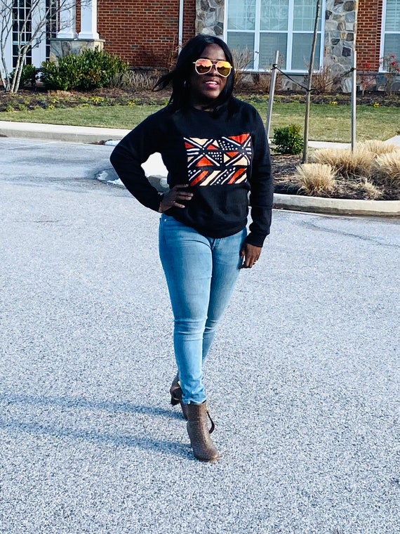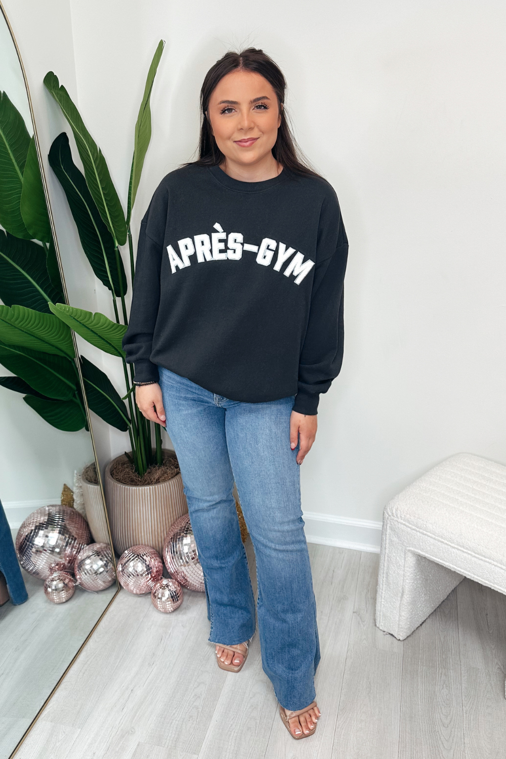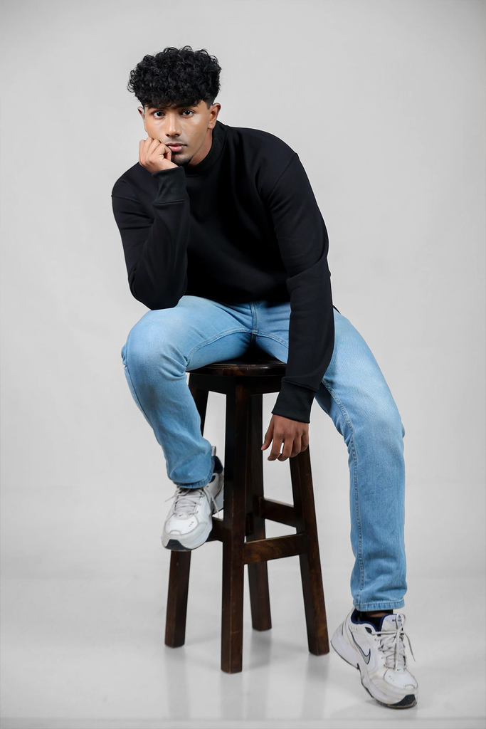 black sweatshirt blue jeans