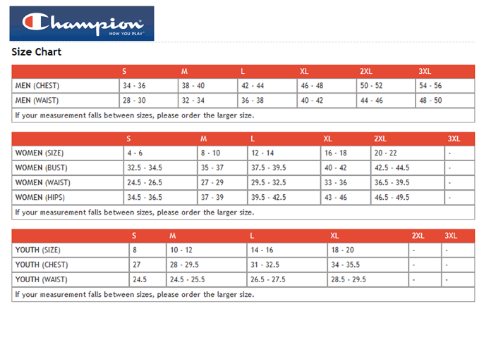 champion sweatshirt size chart
