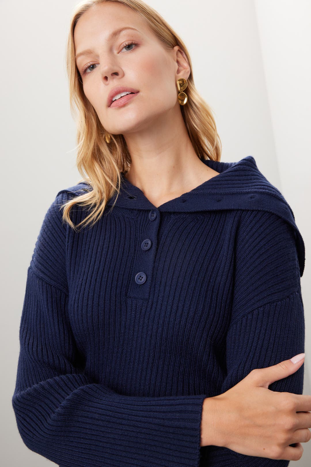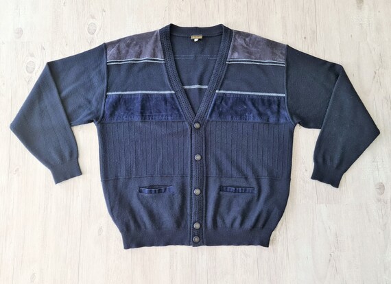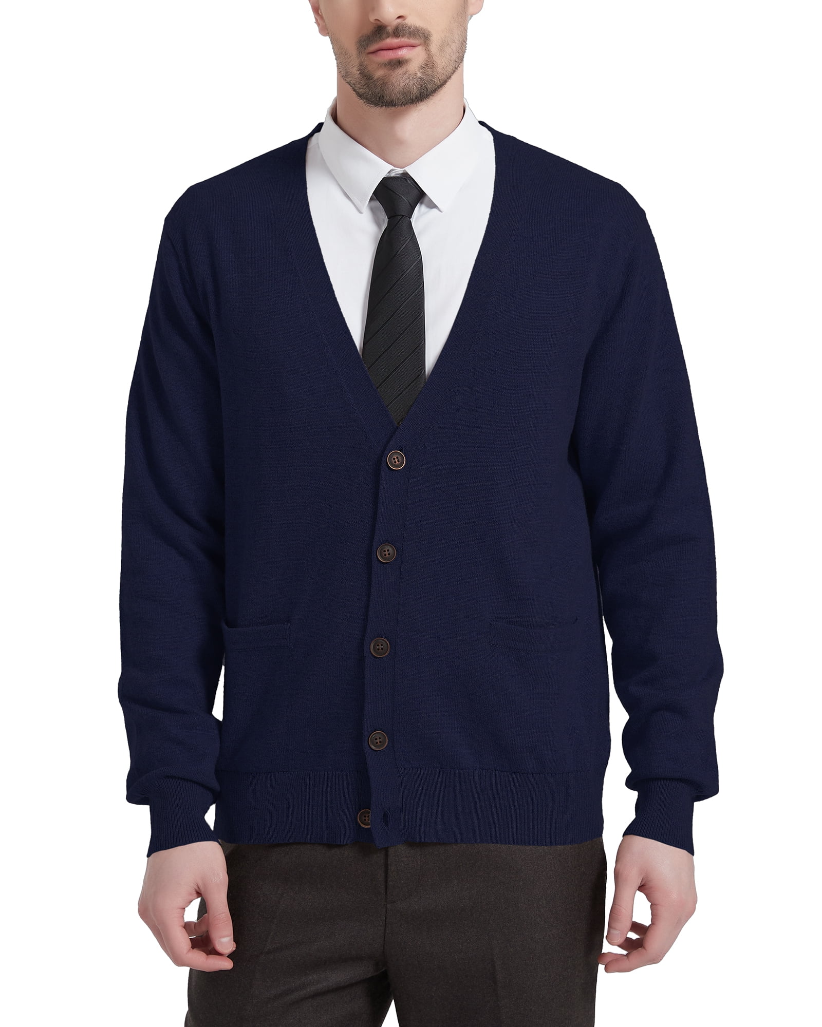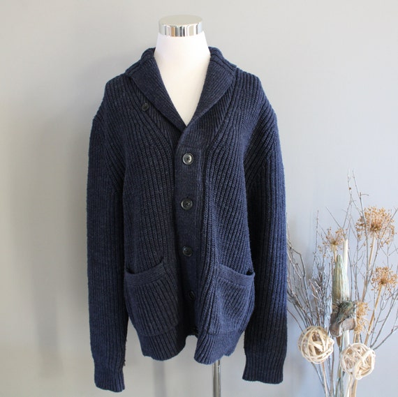 navy button up sweater