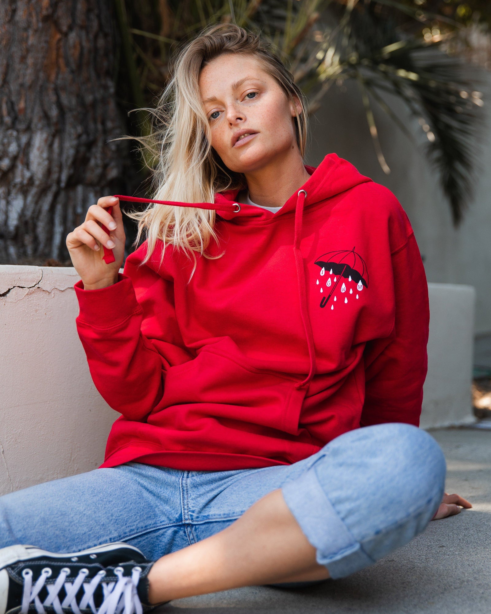 red hooded top