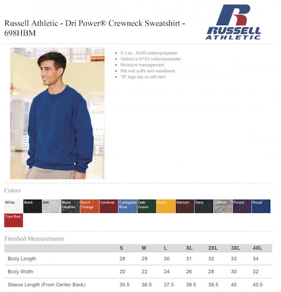 russell athletic sweatshirt size chart