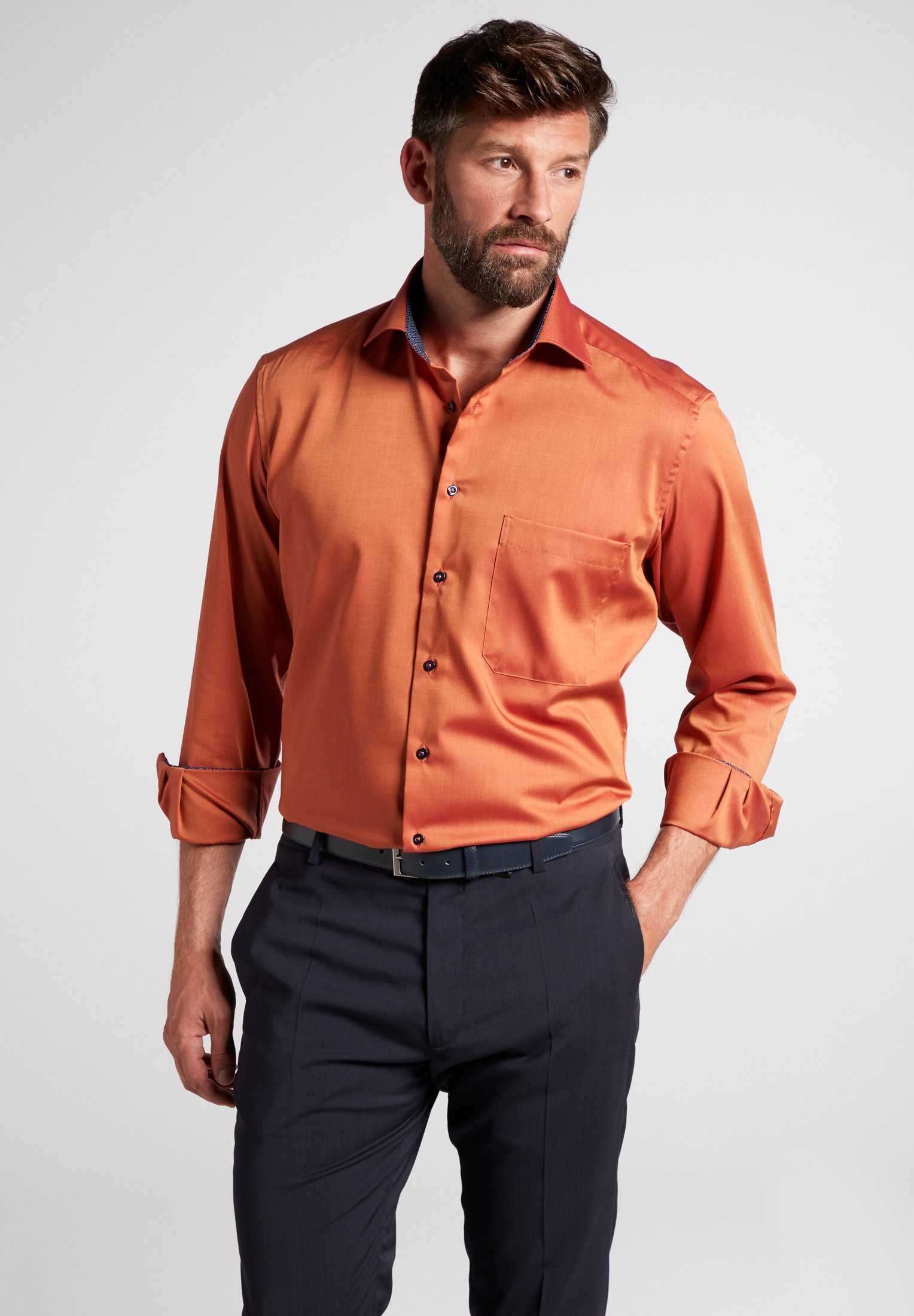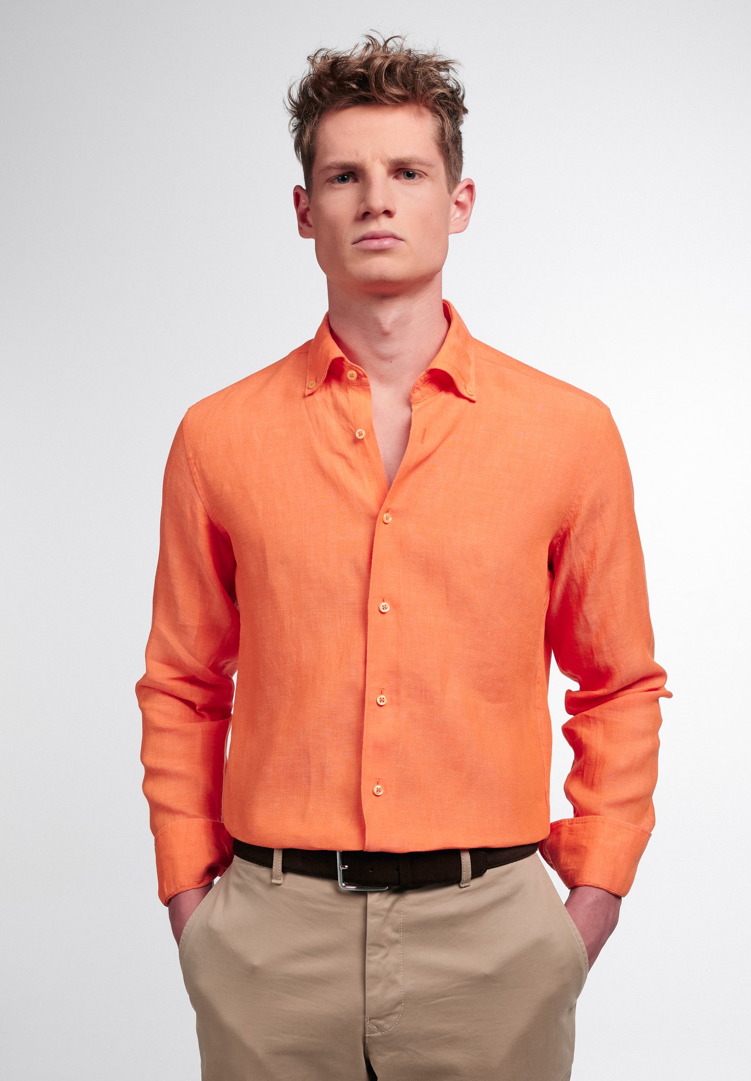 orange shirt grey pants