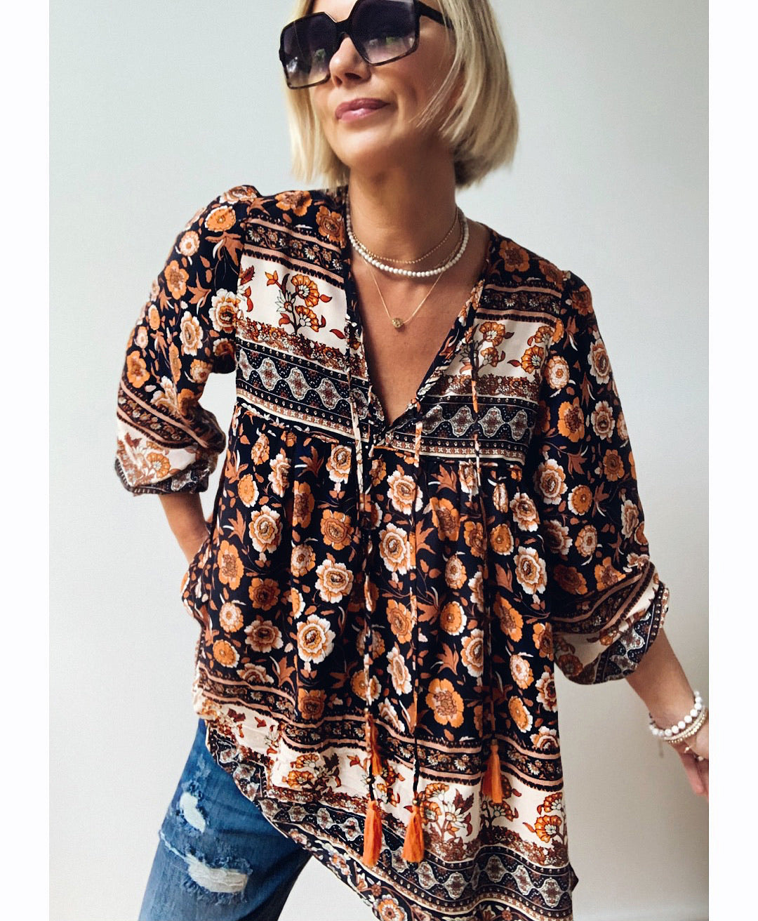 black and orange blouse