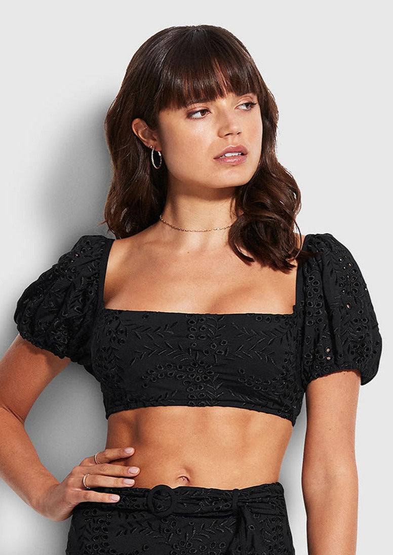black puff sleeve bikini top
