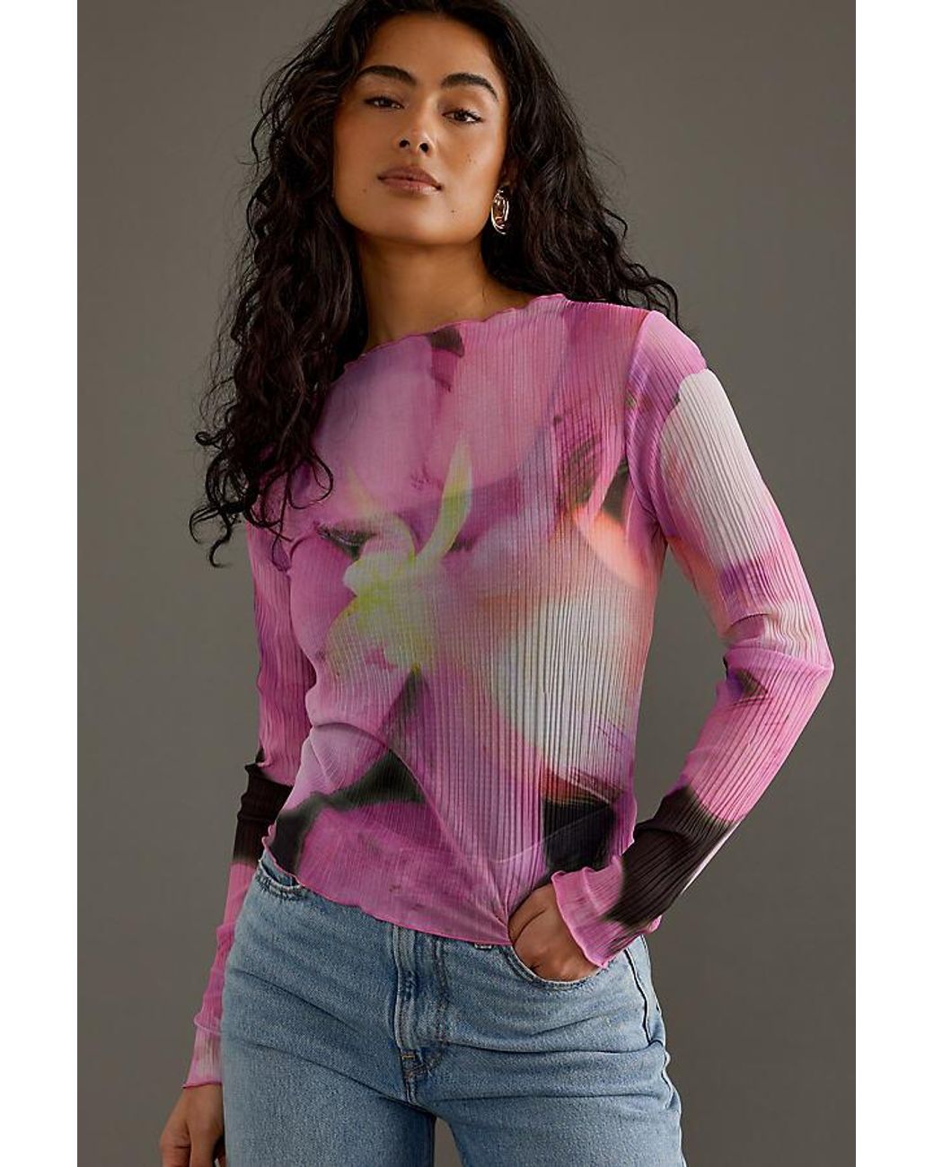 long sleeve patterned mesh top