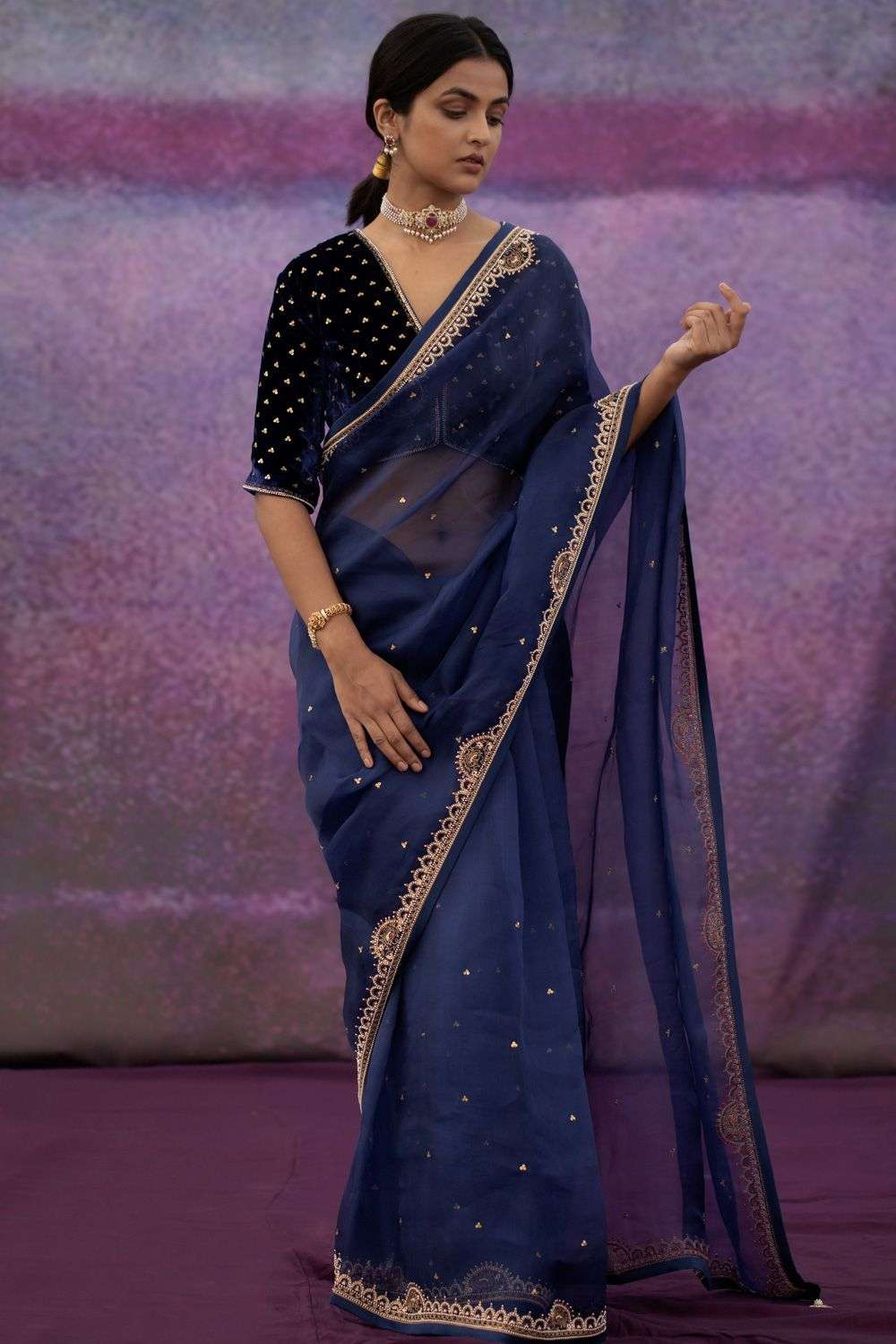 navy blue saree blouse combination