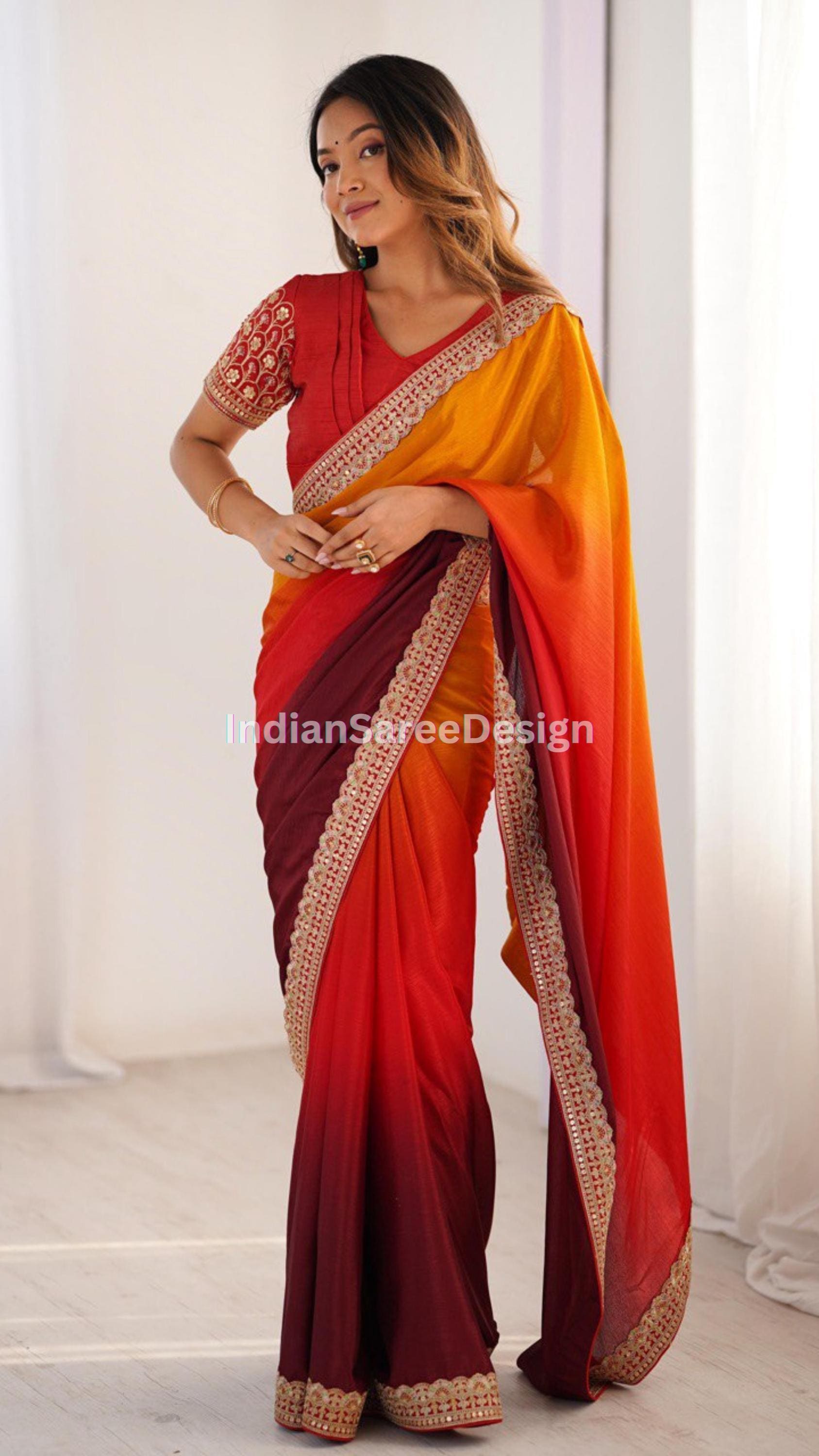 plain orange saree with designer blouse