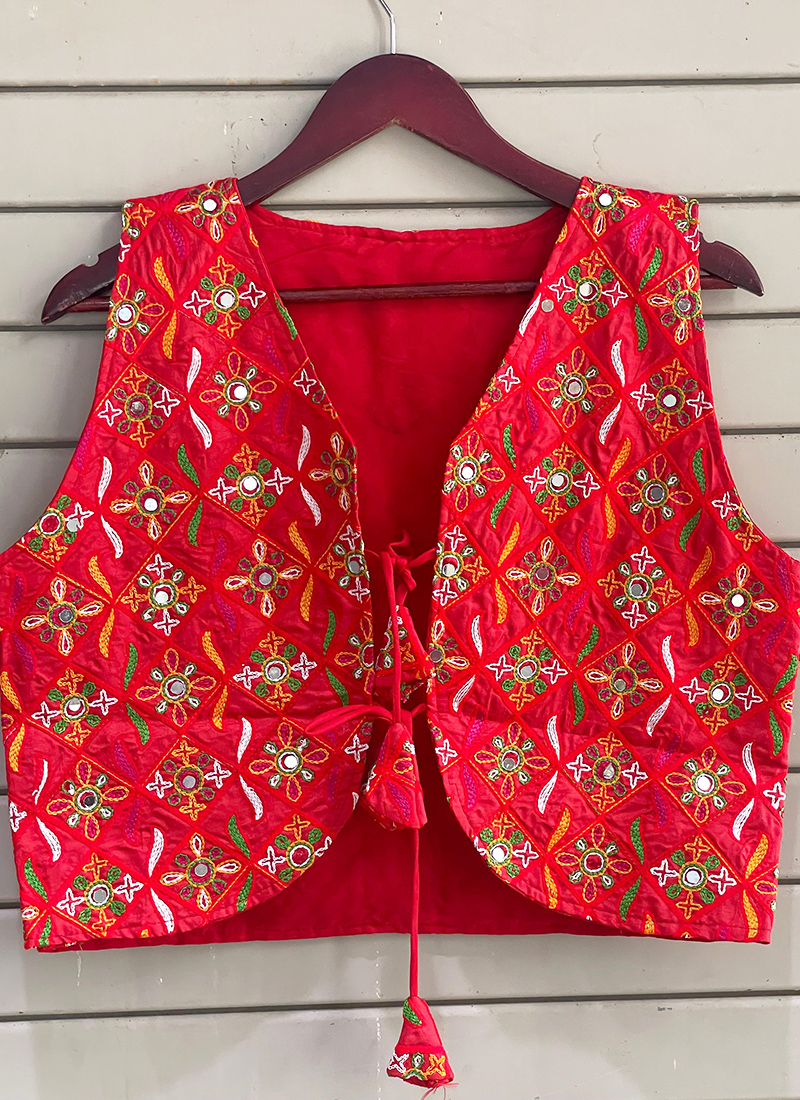 red colour mirror work blouse