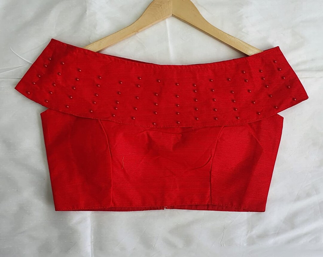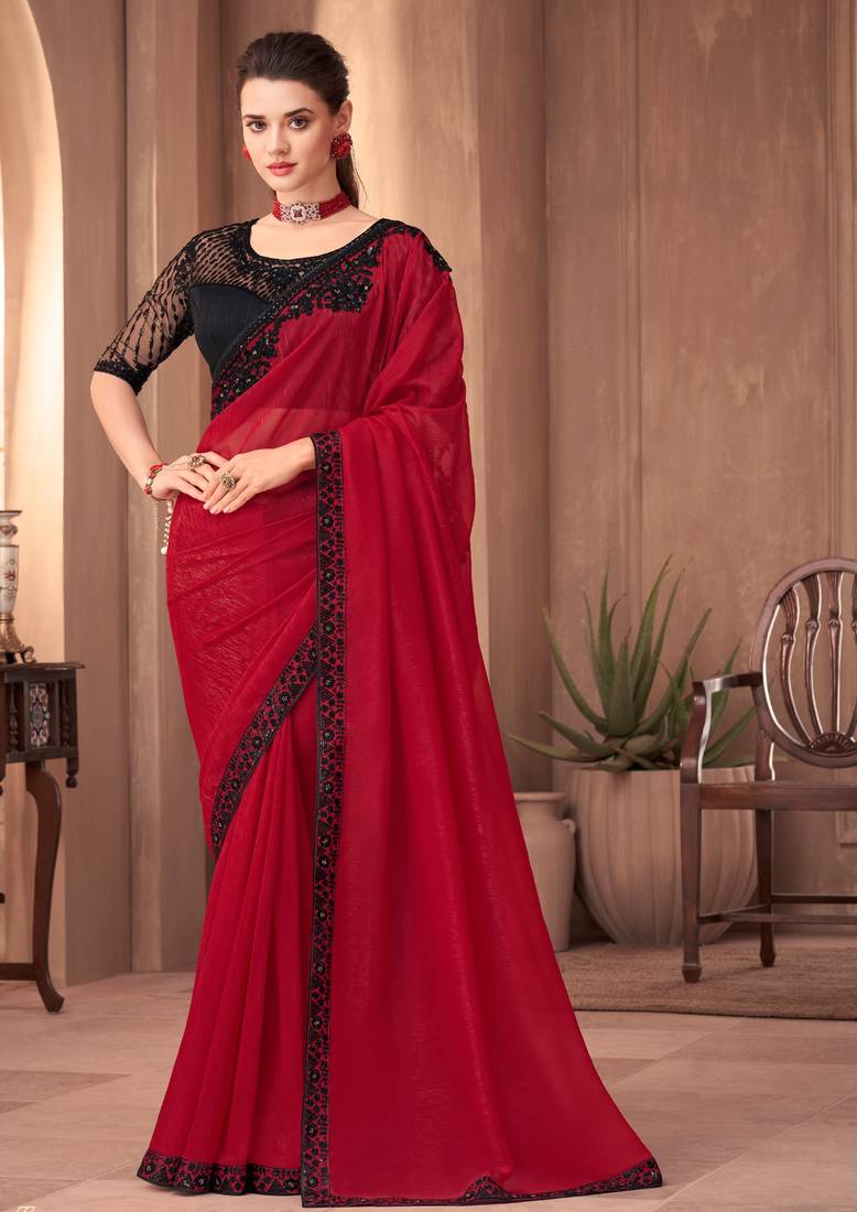 red plain saree with designer blouse