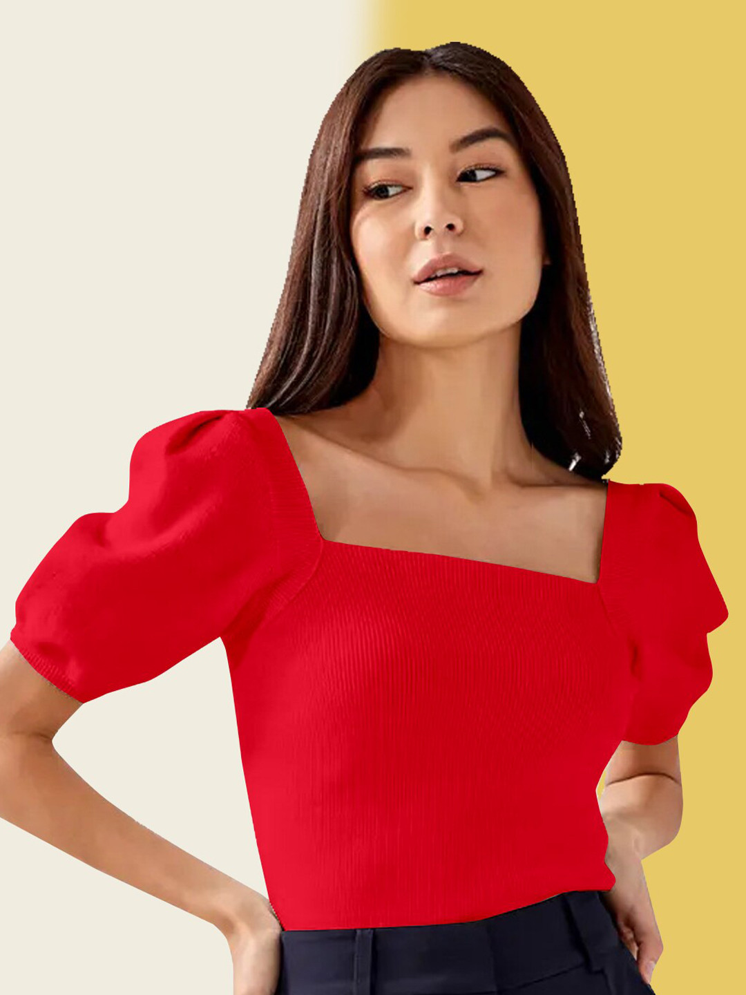 red puff shoulder top