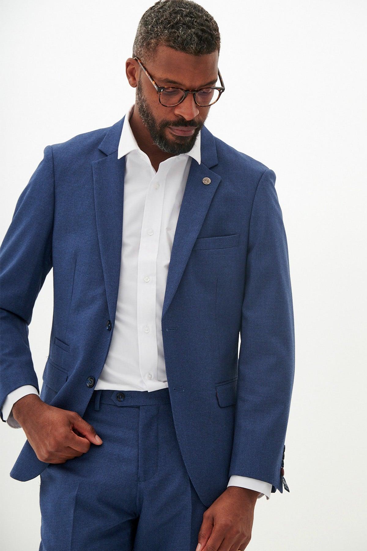 shirt under blue blazer