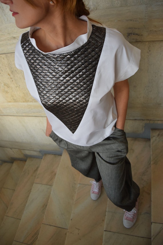 silver and white shirt