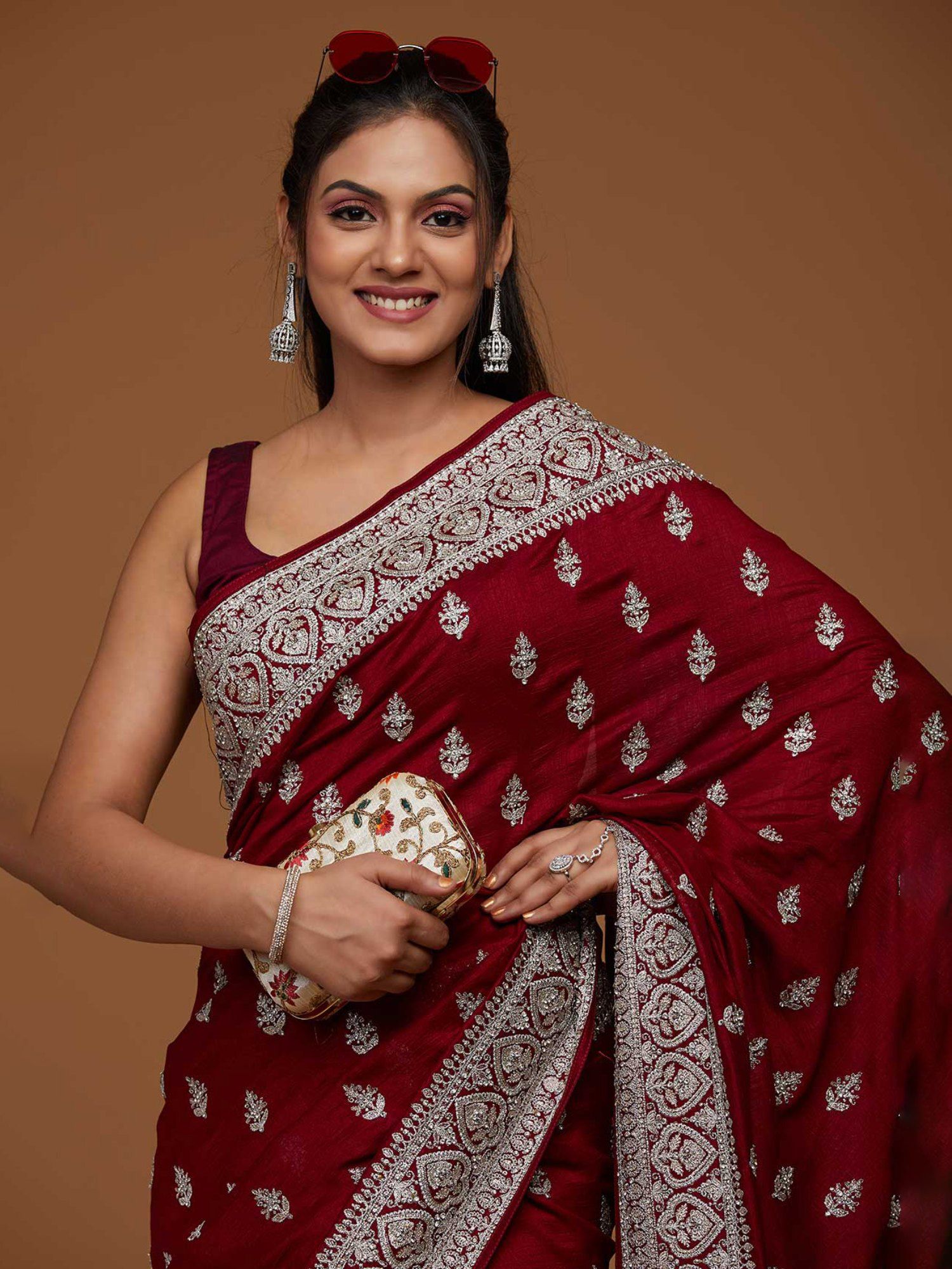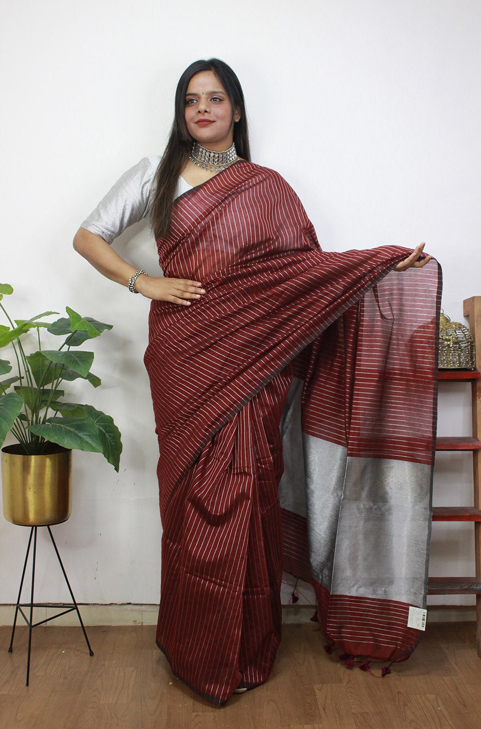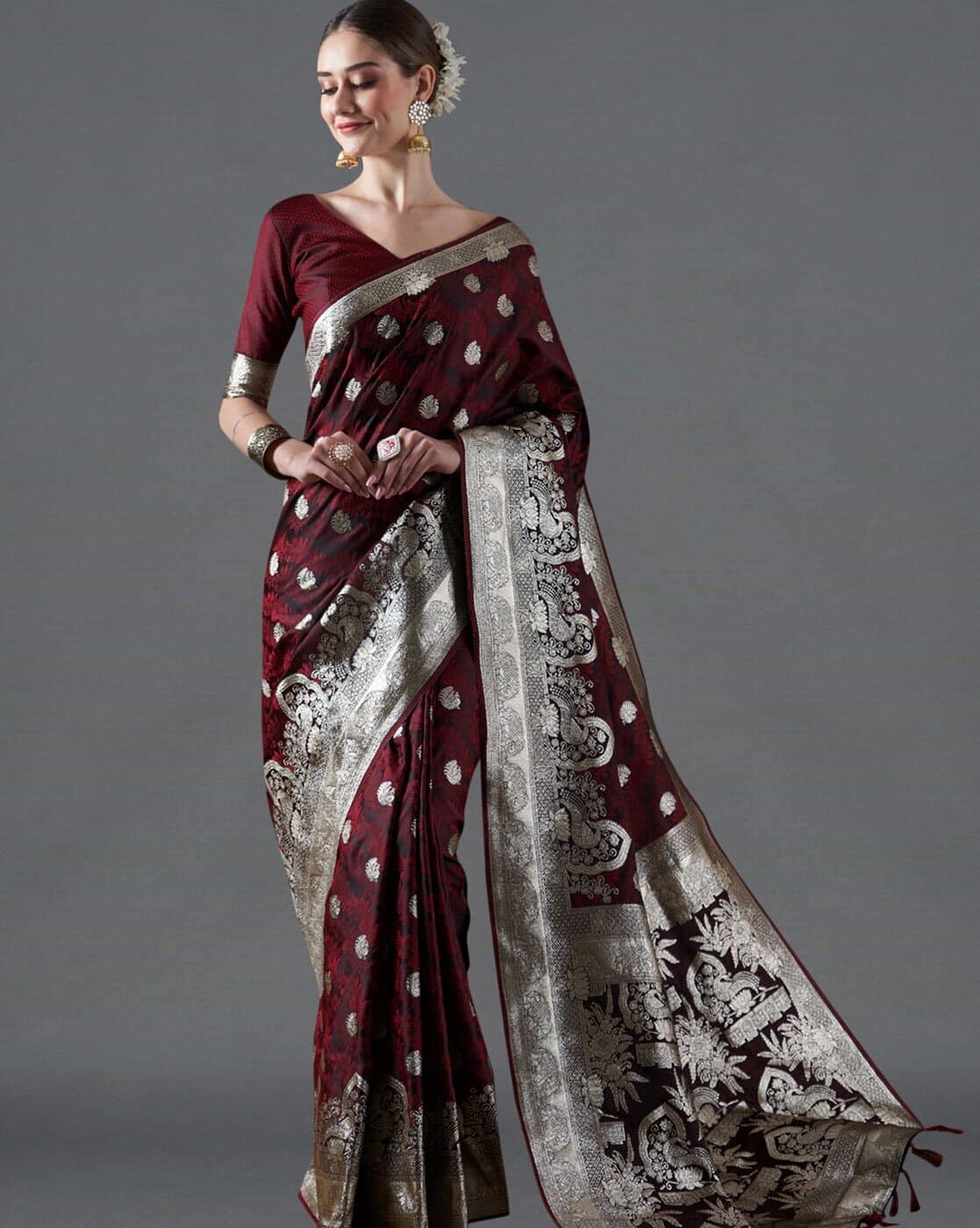 silver saree with maroon blouse