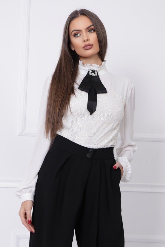 white blouse with black tie