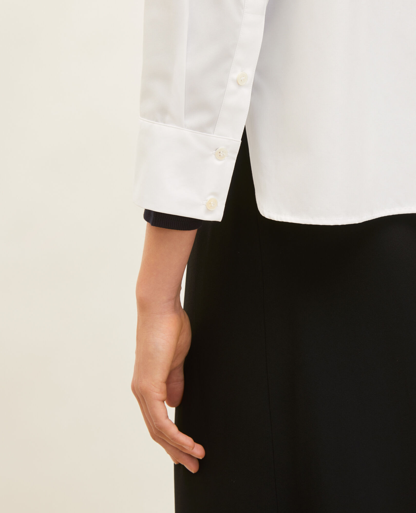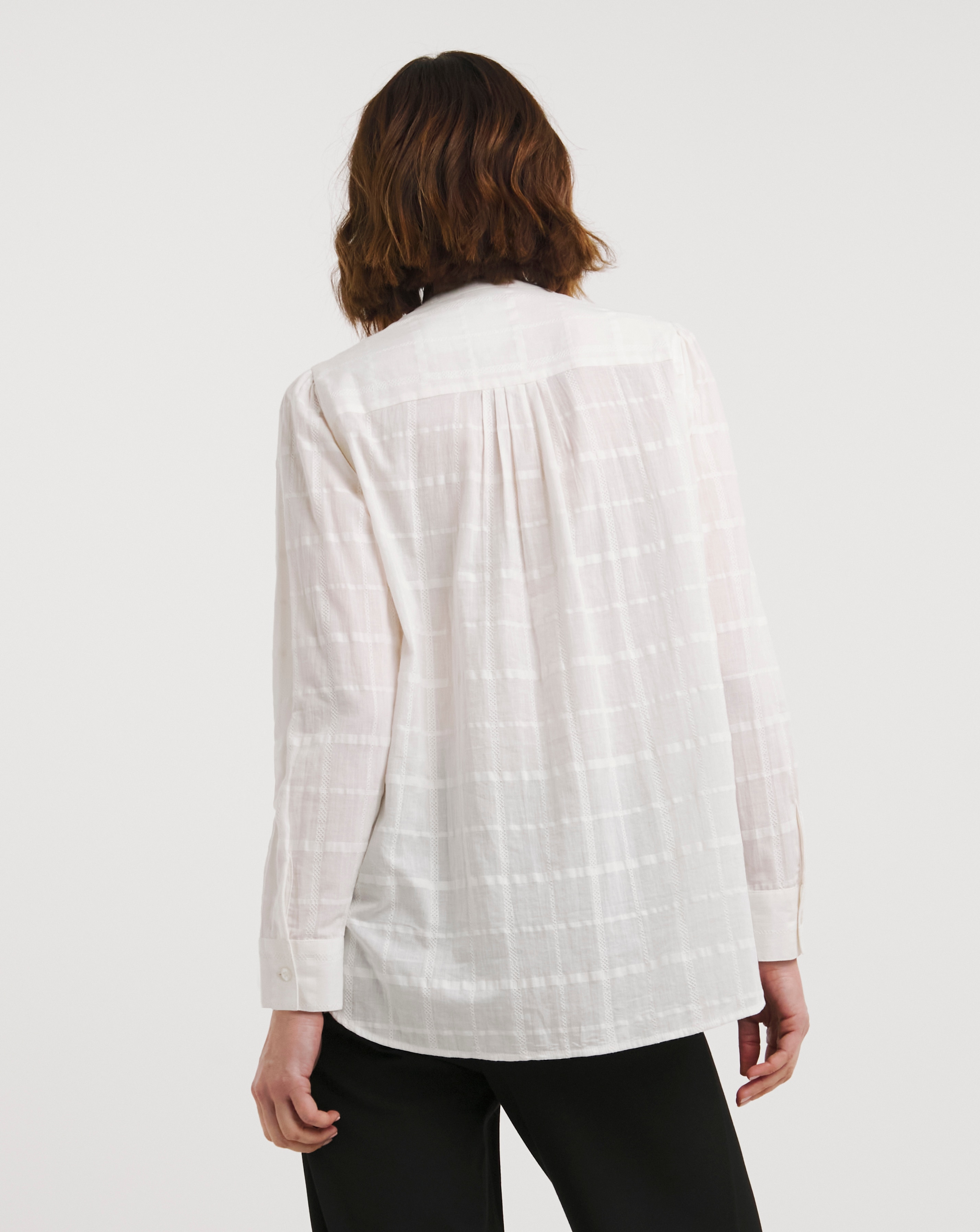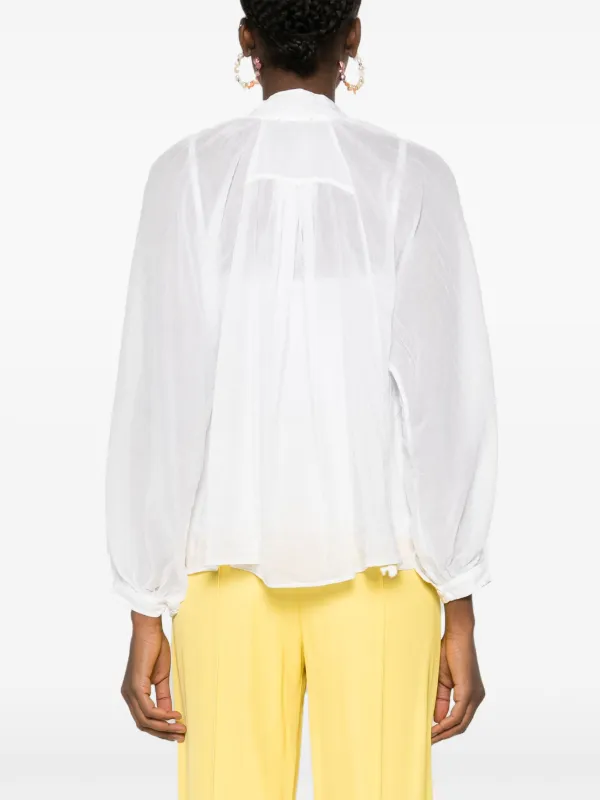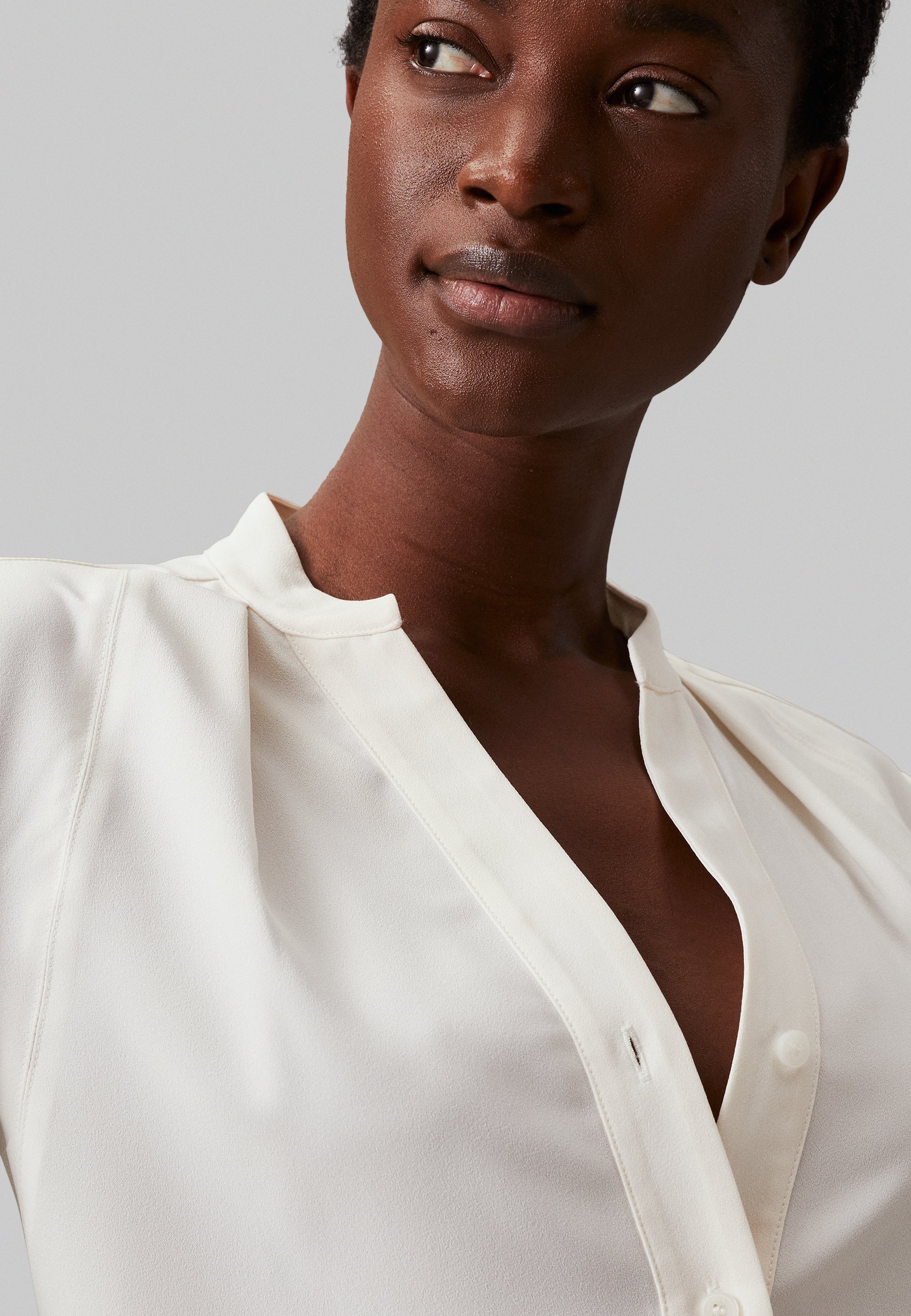 white collarless blouse