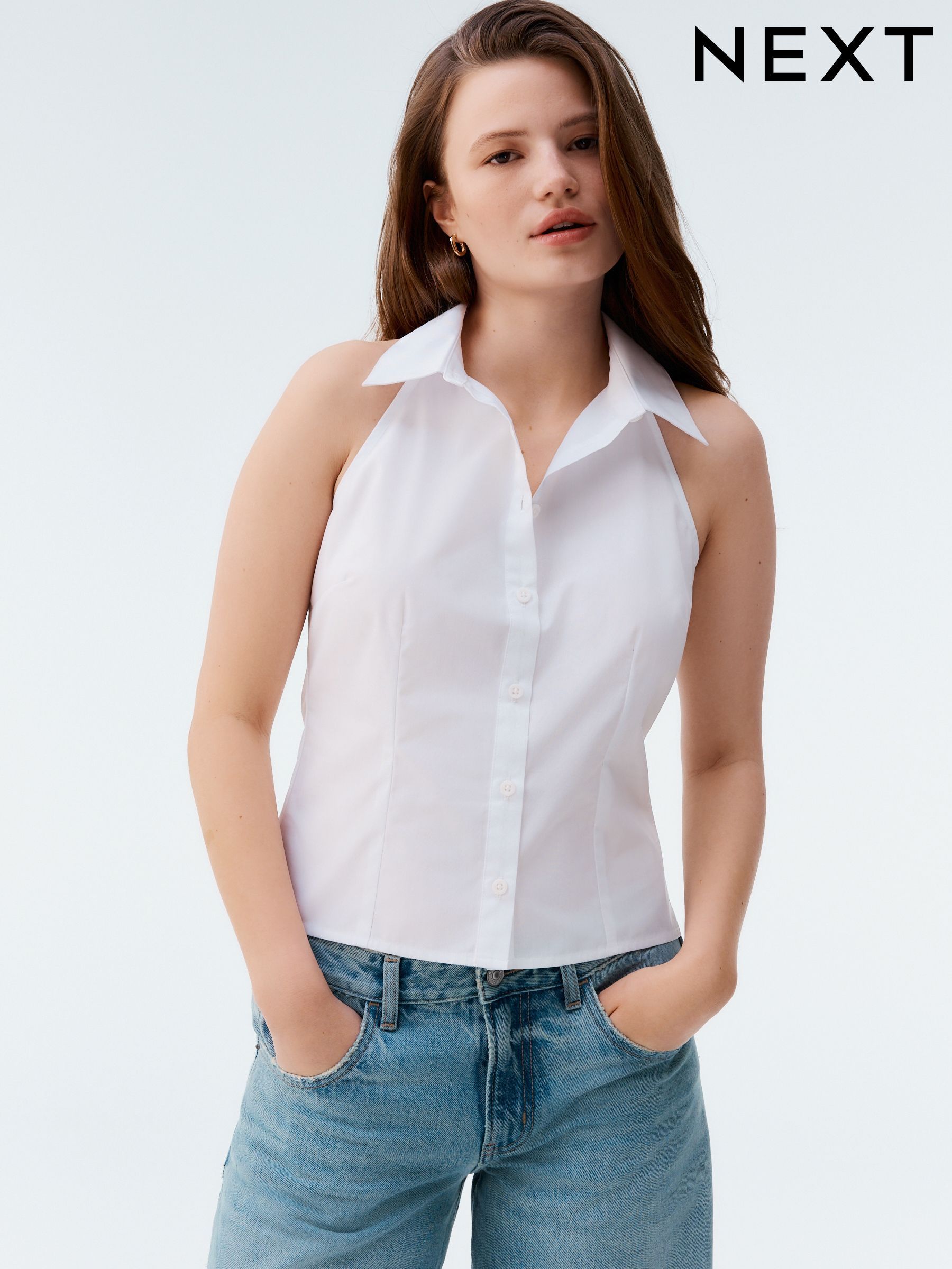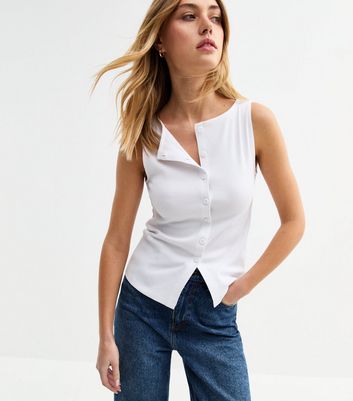 white sleeveless button up blouse