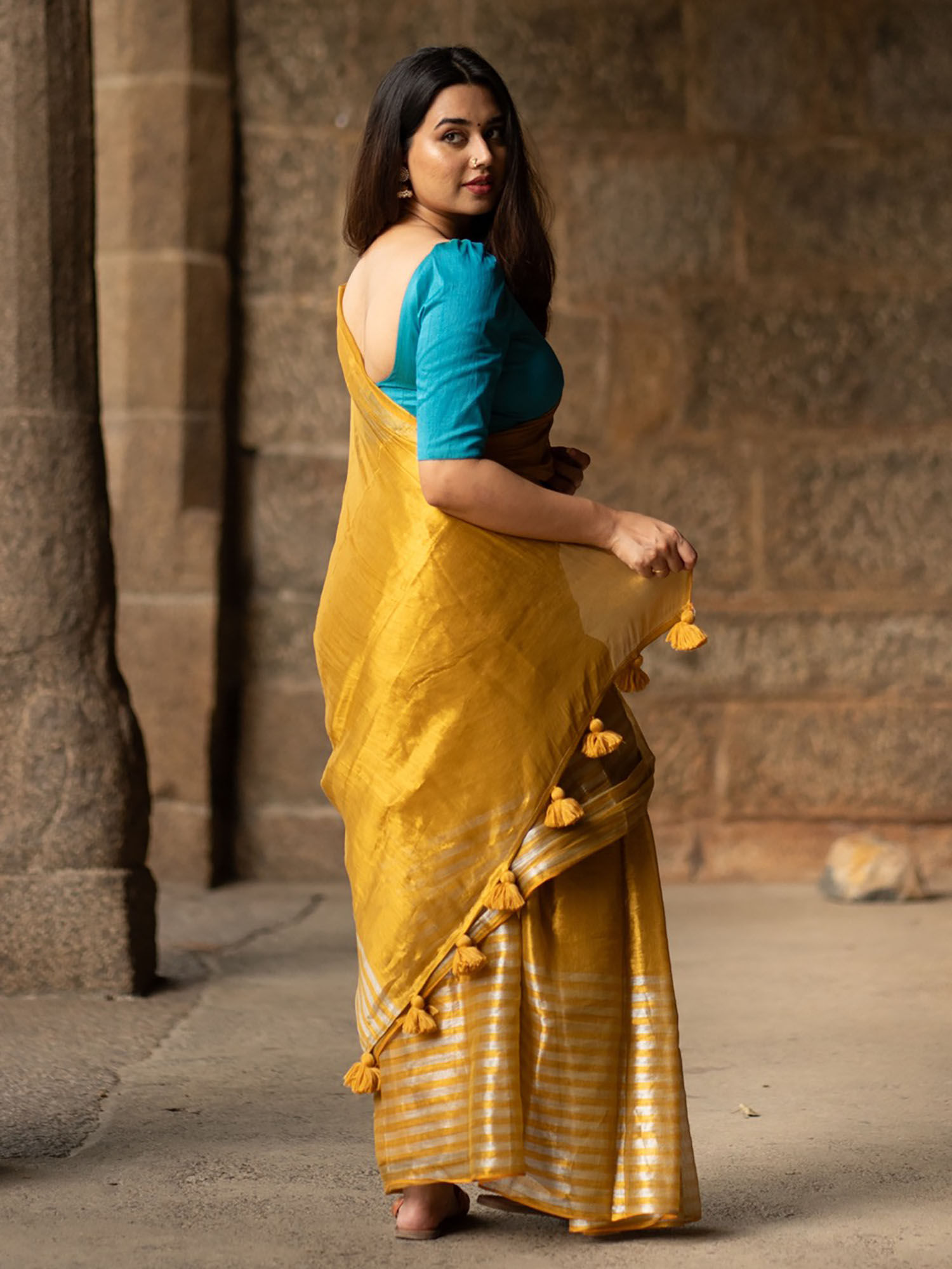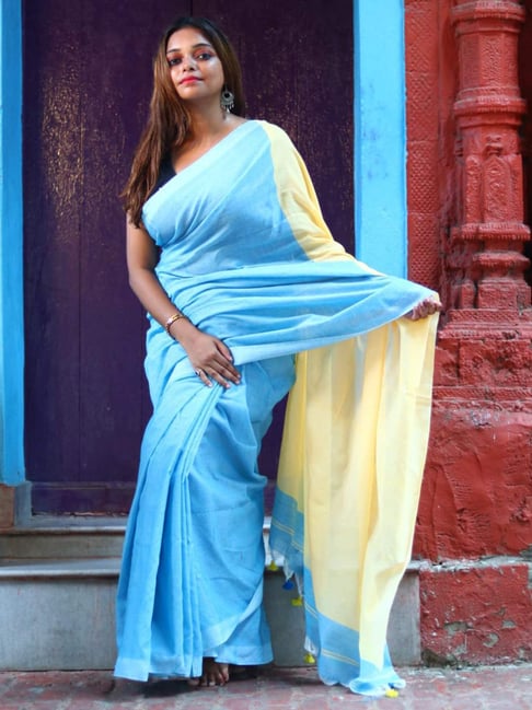 yellow plain saree with blue blouse