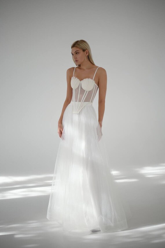 white mesh wedding dress